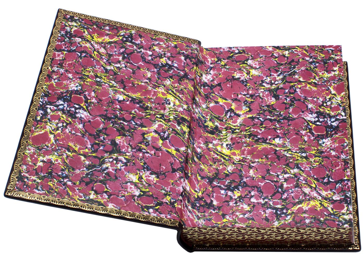 Французский стиль кожаного переплета, специально разработанный для этих книг дизайн тиснения по коже, тонирован обрез книжного блока с трех сторон с нанесением орнамента. Мраморная бумага на форзацах, страницы книг отпечатаны на высококачественной немецкой бумаге Ozon Ivory, тематический дизайн страниц.