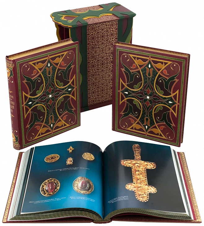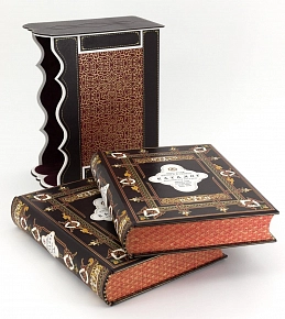 Эксклюзивный французский переплёт на шнурах; Книга украшена сложной художественной аппликацией с использованием качественной кожи натурального дубления (использовано семь видов кожи, в том числе марокен, кениа кид, питон, крокодил); Дизайн выполнен в духе орнаментов восточного стиля «Арабеск», и полностью соответствует тематике издания; Обрез блока украшен авторским рисунком; Дублюра окатана вручную 22-х каратным золотом; Для книги изготовлен индивидуальный полукожаный футляр оригинальной формы