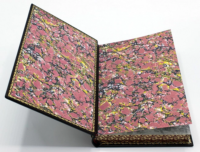 Подарочное издание, французский стиль кожаного переплета, ограниченный тираж. Отпечатан на немецкой бумаге Ozon Ivory, индивидуальный дизайн страниц и иллюстраций, рельефное и цветное тиснение по коже. Книжный блок отшлифован, тонирован с нанесением орнамента. Полностью ручная работа.