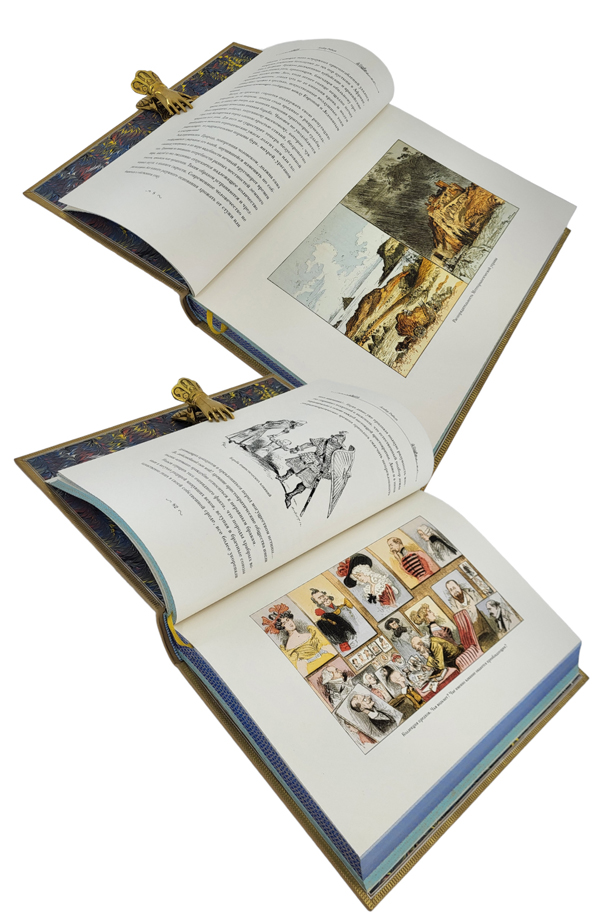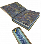 Книга исполнена по старинной французской технологии; Переплёт цельнокожаный, из искусственно состаренной кожи. Художественное, многоцветное тиснение по коже (воспроизведен авторский рисунок). Бумага дизайнерская, кремовая. Блок сшит на пяти шнурах. Форзац выполнен из мраморной бумаги ручного крашения; Дублюра окатана вручную; обрез блока с художественным оформлением: окрашен в два цвета и гравирован вручную. Ляссе шелковое, каптал ручного плетения. Индивидуальный, фигурный футляр с кожаной окантовкой.