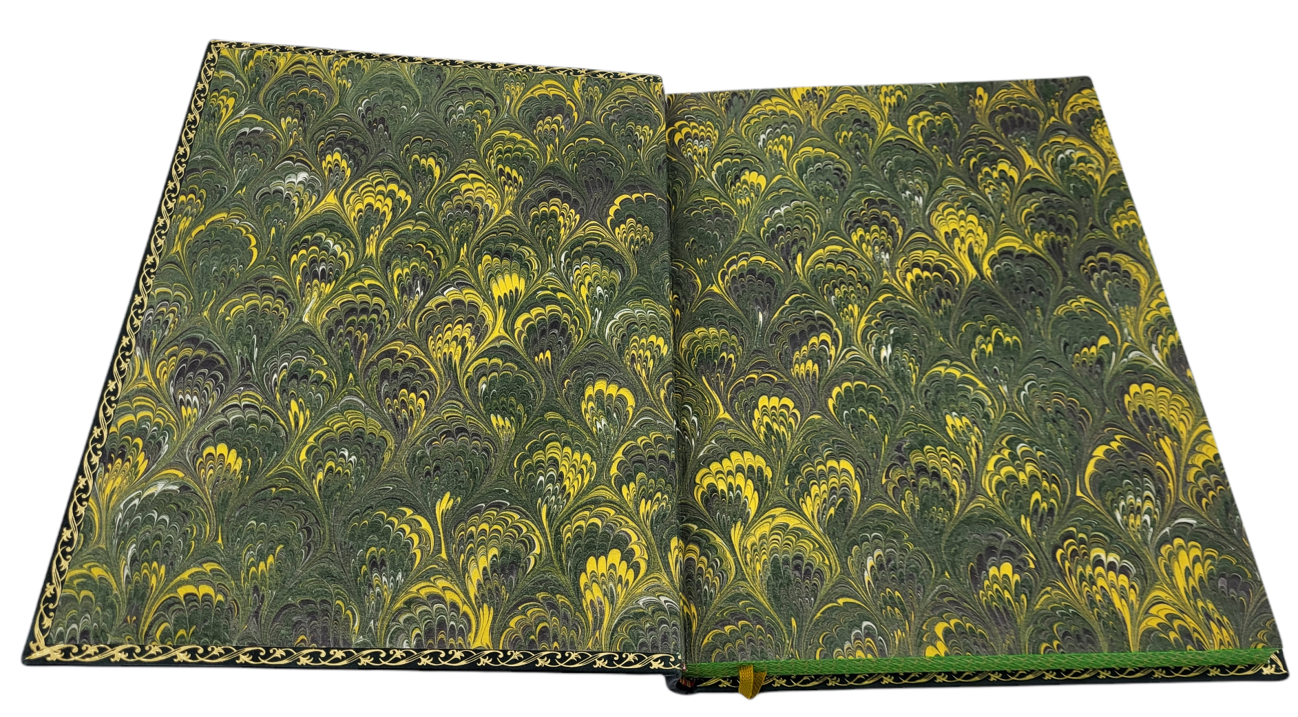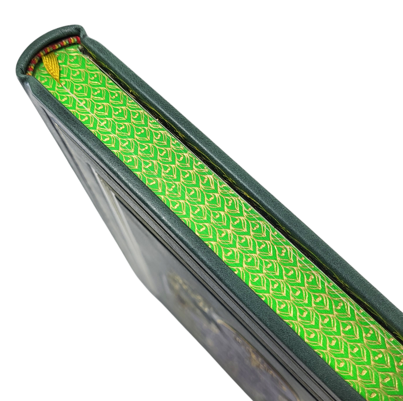 Особенности оформления и переплета: Книга исполнена по старинной французской технологии; Переплёт цельнокожаный, из застаренной вручную кожи; Художественное двухцветное тиснение на обложке и корешке; вставки из шагреневой кожи другого цвета. Бумага дизайнерская, кремовая (Франция); Блок сшит на пяти шнурах; Форзац выполнен из мраморной бумаги ручного крашения; Дублюра окатана вручную 23-каратным золотом; Обрез блока с художественным оформлением: окрашен и гравирован вручную; Ляссе шелковое, каптал ручного плетения; Индивидуальный футляр с кожаной окантовкой.