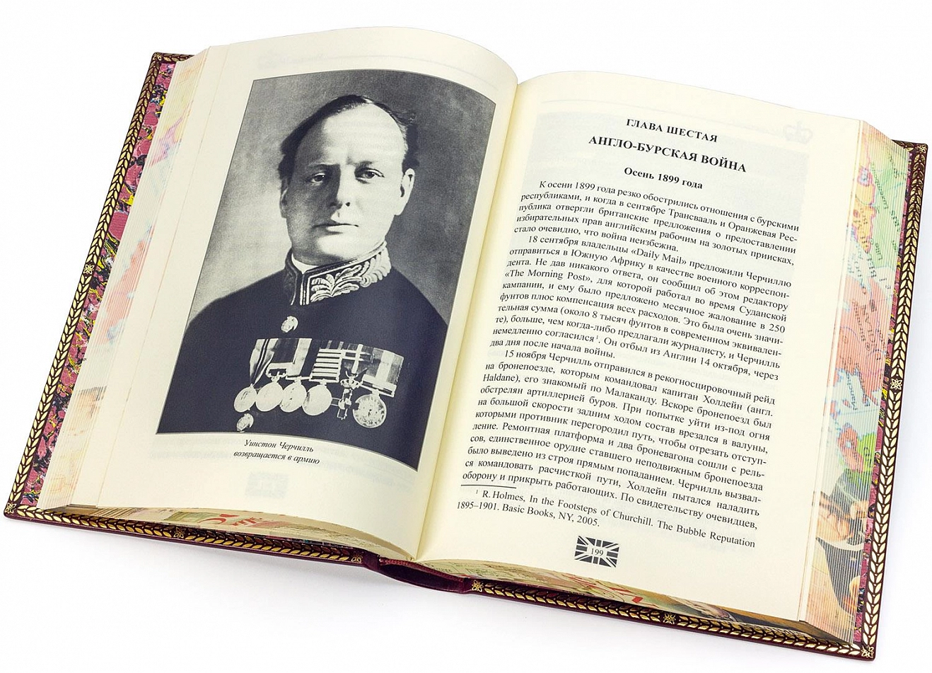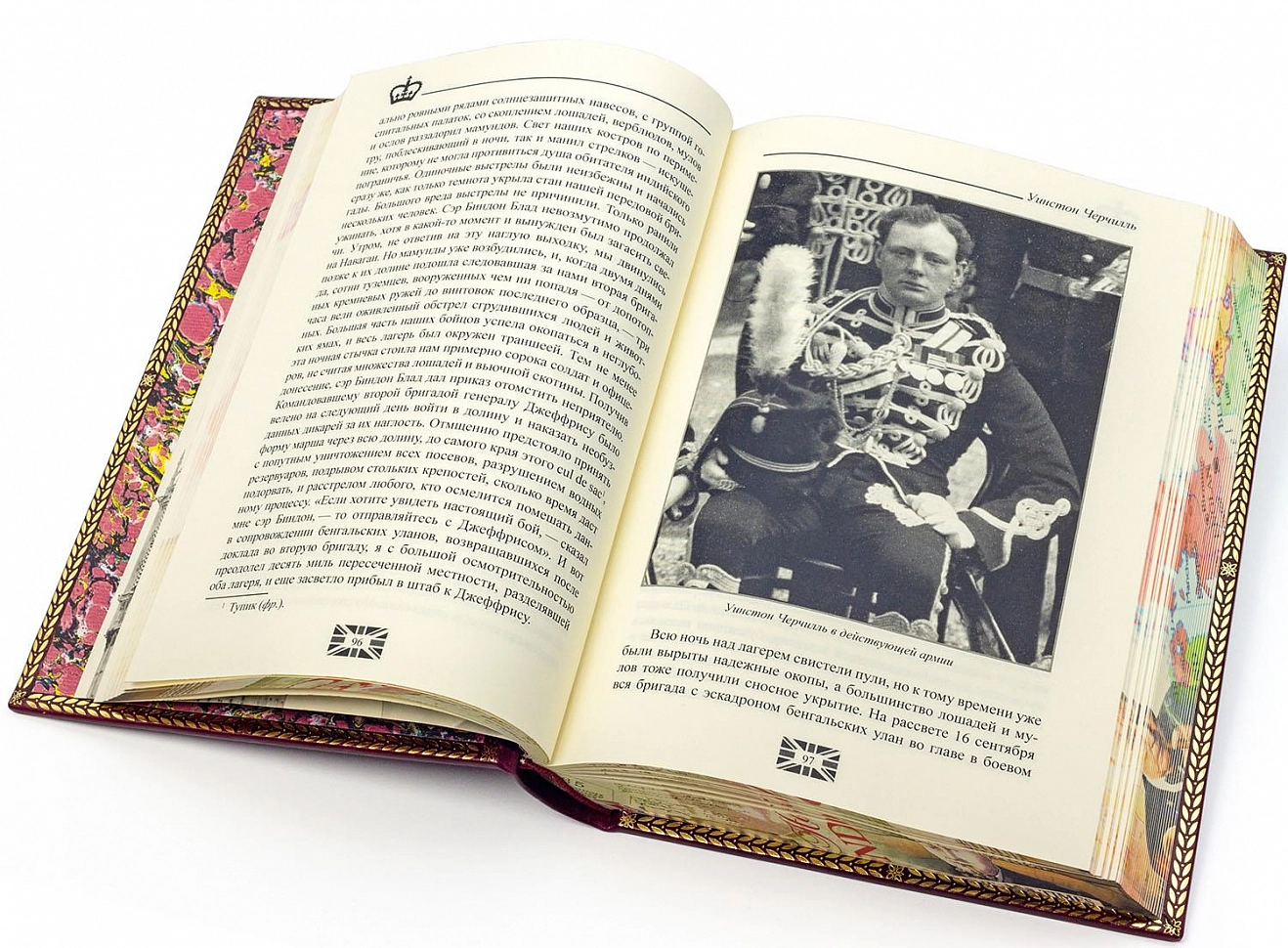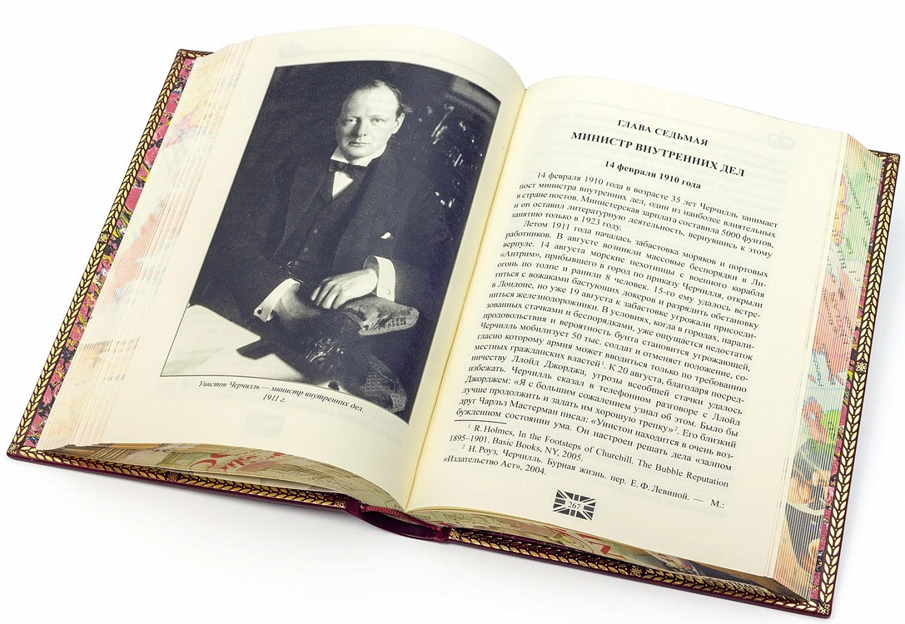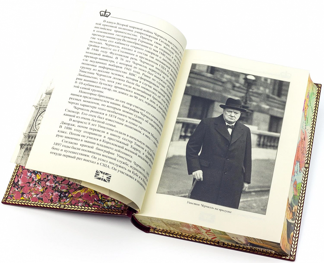 Подарочная книга "Уинстон Черчилль" АННОТАЦИЯ Книга Уинстон Черчилль в кожаном переплете. Ручная работа наших мастеров - кожаный переплет, индивидуальный стиль оформления, тиснение золотом, в ручную обработан и тонирован блок страниц с нанесением рисунка в стиле плакатной живописи. Отличный, дорогой подарок для человека увлекающегося историей. ИСПОЛНЕНИЕ Французский, исторический стиль переплета, тиснение цветное и золотом, блок страниц отшлифован и тонирован в стиле плакатов советского времени. Все материалы высокого качества, плотная, белая, плотная бумага, натуральная переплетная кожа. Вы также можете заказать ручной кожаный переплет любых своих книг, собраний сочинений, оформить личную библиотеку. Наша переплетная мастерская полностью подготовит дизайн, стиль, бесплатно создадим для Вас Экслибрис. Мы также реставрируем старые книги, создаем деловую атрибутику, ежедневники в кожаном переплете. Выбранные книги Вы можете осмотреть у нас в мастерской, посмотреть как они создаются или же заказать выезд менеджера для ознакомления с нашими книгами в кожаном переплете. ОПИСАНИЕ Сэр Уинстон Леонард Спенсер Черчилль — британский государственный и политический деятель, премьер-министр Великобритании в 1940—1945 и 1951—1955 годах; журналист, писатель, художник, почётный член Британской академии, лауреат Нобелевской премии по литературе. Уинстон Черчилль – автор многих книг историко-мемуарного жанра. В 1930-е годы он завершил многотомный труд "Мировой кризис, 1916-1918" и написал автобиографическую книгу "Ранние годы моей жизни", много лет работал над шеститомной "семейной" эпопеей "Жизнь Мальборо", опубликовал шеститомный труд "Вторая мировая война" (1948-1954), четырехтомную "Историю англоговорящих народов" (1956-1958) и др. Его литературное наследие составляет более 40 томов. В 1953 году Черчиллю была присуждена Нобелевская премия по литературе.