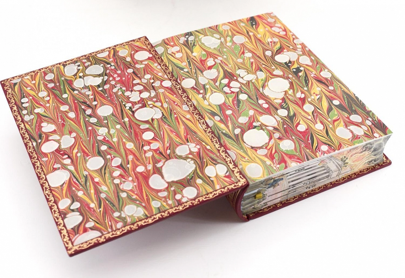 Классический ручной французский переплет на шнурах. Шагреневая кожа с инкрустацией на обложке и корешке. Обрезы с трех сторон украшены ручной, авторской, тематической росписью . Тиснение золотой фольгой, ручная накатка дублюры. Форзац из мраморной бумаги ручного крашения. Бумага мелованная. Дизайн и оформление переплета.
