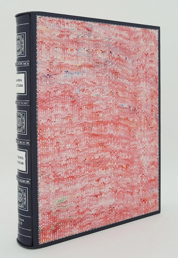 ЦВЕТАЕВА М. «ОТ ПОЭТА К ПОЭТАМ» АННОТАЦИЯ Стихотворения. Москва. Издательство Столяровых. 2018. Коллекционное издание. Тираж 25 номерных экземпляров. Каллиграфия и иллюстрации И.А. Дмитренко. В сборник вошли стихотворения «К Пушкину», «К Волошину», «К Ахматовой» и др. ОФОРМЛЕНИЕ Отпечатано на хлопковой бумаге. Французский переплет на шнурах. Натуральная шагреневая кожа. Переплет украшен тиснением и аппликацией. Элементы ручной росписи по коже. Обрез окрашен и гравирован вручную. Ручная накатка дублюры. Форзац оформлен мраморной бумагой ручного крашения. Индивидуальный полукожаный футляр. Эксклюзивное издание.