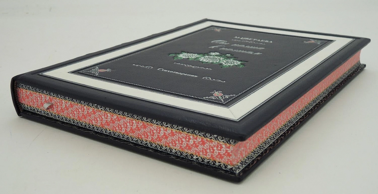 ЦВЕТАЕВА М. «ОТ ПОЭТА К ПОЭТАМ» АННОТАЦИЯ Стихотворения. Москва. Издательство Столяровых. 2018. Коллекционное издание. Тираж 25 номерных экземпляров. Каллиграфия и иллюстрации И.А. Дмитренко. В сборник вошли стихотворения «К Пушкину», «К Волошину», «К Ахматовой» и др. ОФОРМЛЕНИЕ Отпечатано на хлопковой бумаге. Французский переплет на шнурах. Натуральная шагреневая кожа. Переплет украшен тиснением и аппликацией. Элементы ручной росписи по коже. Обрез окрашен и гравирован вручную. Ручная накатка дублюры. Форзац оформлен мраморной бумагой ручного крашения. Индивидуальный полукожаный футляр. Эксклюзивное издание.