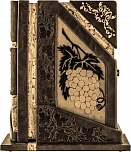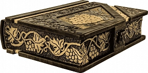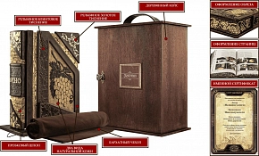 Составной переплет «Брадель», ручной работы, выполнен из комбинации пробкового шпона и натуральных кож (кожа «Gabinetto», кожа «Sabbiarossa» производства итальянской кожевенной фабрики «Benericetti»). Обложка книги двухуровневая, оформлена многоуровневым тиснением: глубоким блинтовым и рельефным золотым, с использованием фольги «Luxor 240». Оформлена ручной продавкой, тонировкой сиеной натуральной. Обрез декорирован в уникальной технике «OldGold». Подставка выполнена в том же стиле, что и книга.