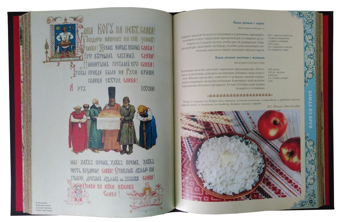 Книга включает более 300 рецептов различных блюд. В ней можно найти рецепты салатов, первых блюд, блюд из мяса, птицы, рыбы, грибов и молочных продуктов, рецепты кондитерских изделий, а также солений и других домашних заготовок. Этот красочный альбом поможет читателям приобщиться к искусству кулинарии, а обилие цитат из русской литературы и замечательная русская живопись на кулинарную тему сделают альбом великолепным подарком.