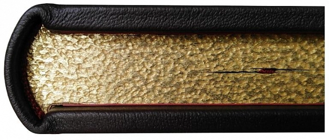 Французский цельнокожаный переплет ручной работы на шнурах. Натуральная переплетная кожа. Форзац составной на кожаной слизуре. Дизайнерская бумага. Каптал двойной наборный, ручное плетение из шелковых нитей. Обрез торшонированный золотой фольгой. Ляссе шелковое. Тиснение полиграфической фольгой, блинтовое тиснение.