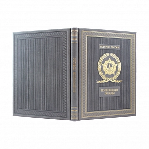 Составной переплет «Брадель», ручной работы, выполнен из комбинации натуральной кожи (кожа «Robbat Cognac», кожа «Marma Parle», кожа «Robbat Wisky» производства итальянской кожевенной фабрики «Claudio»). Обложка книги двухуровневая, оформлена латунными холитенами (цвет «Антик»), глубоким блинтовым и рельефным золотым тиснением, с использованием фольги «Luxor 240». Обрез книги оформлен в уникальной технике «Old Gold». Образ книги завершает подставка в том же сочетании материалов, что и книга.