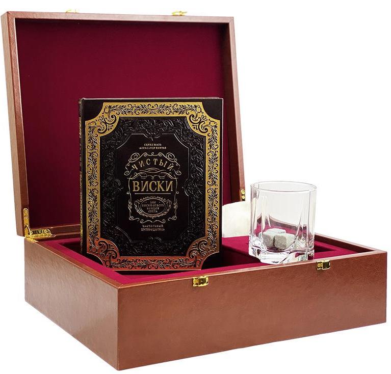 Подарочный набор включает в себя путеводитель по виски в кожаном переплете «Чистый виски. Настольный путеводитель». В оформлении переплета применяется сочетание блинтового и золотого тиснения, выполненных на высококачественной натуральной коже. Дизайн дополнен крашенным в тематику обрезом. Ляссе. Дублюры. Так же в набор входит стакан под виски и охлаждающие камни для напитков, оформленных в деревянной коробке, обтянутой кожей.