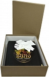 Книга представлена в оригинальном подарочном коробе, сделанном из мдф и обтянутым вручную высококачественной натуральной кожей. Цельнокожаный переплёт ручной работы, украшен иллюстрированной вставкой из цветного металла. Обложка двухуровневая. Металлические уголки дополняют дизайн и сохраняют книгу при использовании.
