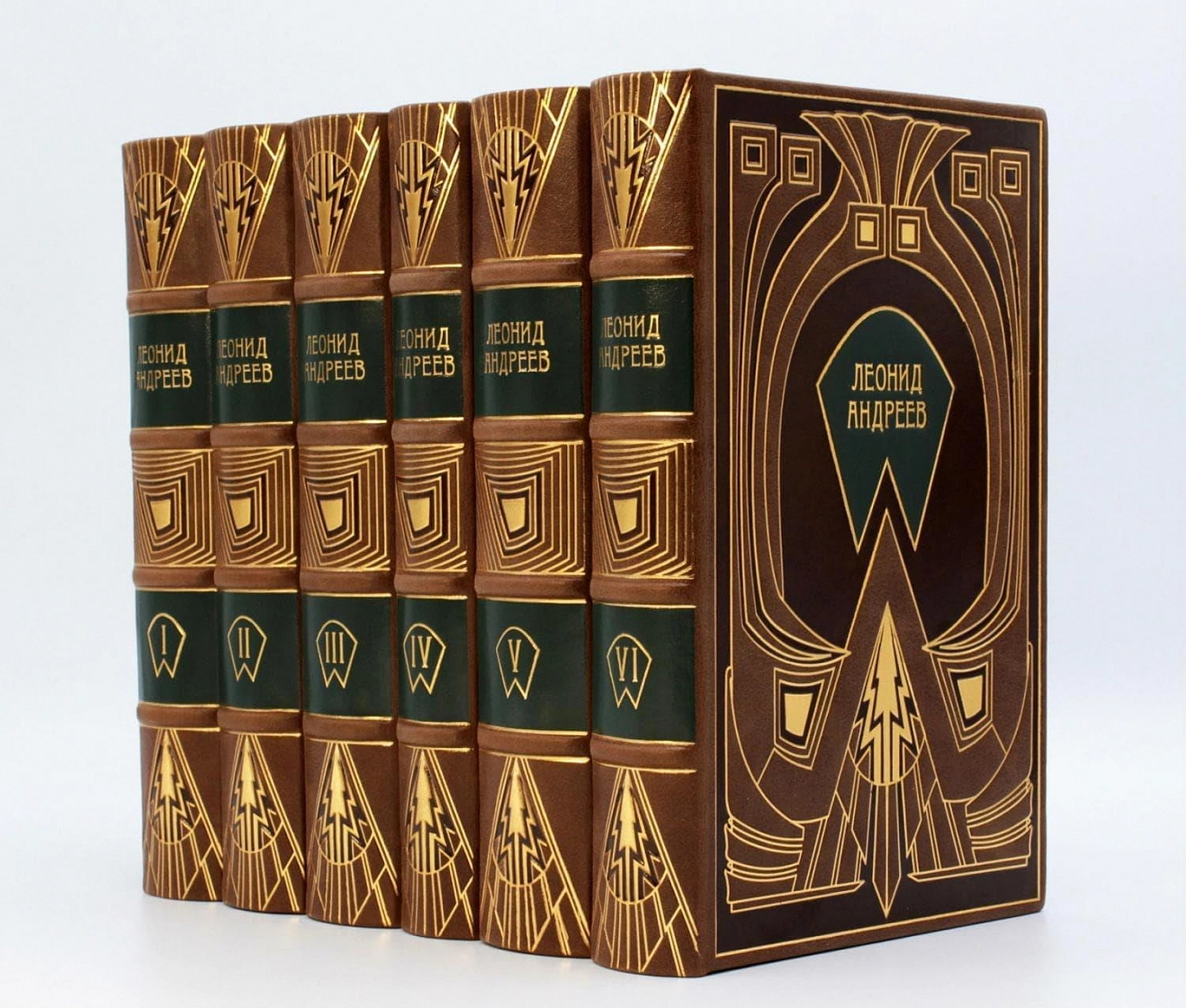 Подарочное собрание сочинений Андреева Л.Н. (в 6-и томах) ОФОРМЛЕНИЕ Французский стиль кожаного переплета, индивидуальный дизайн оформления. Тиснение цветное, блинтовое и золотом, дизайнерская мраморная бумага в оформлении. Полностью ручная работа от нашей мастерской. СОДЕРЖАНИЕ Первый том: вошли рассказы 1898—1903 гг. Второй том: вошли рассказы и пьесы 1904—1907 гг. Третий том собрания сочинений Леонида Андреева: вошли повести, рассказы и пьесы 1908—1910 гг. Четвертый том: рассказы и пьесы 1911—1913 гг. и роман «Сашка Жегулёв». Пятый том: это рассказы и пьесы 1914—1915 гг., а также сатирические миниатюры для сцены, созданные Л. Андреевым в 1908—1916 гг. Шестой том: прозаические произведения 1916—1919., пьесы и статьи.