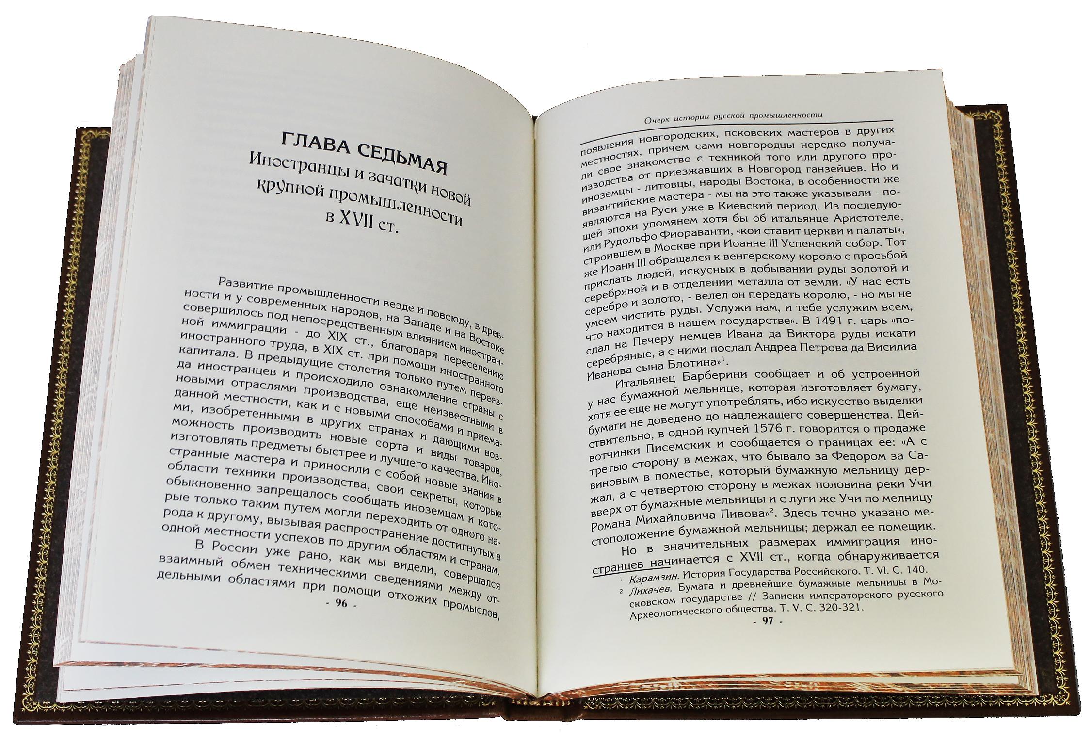Автор на основе археологических данных и различных письменных источников подробно анализирует хозяйственное положение России за период с Древней Руси до XVIII века.В книге рассматриваются следующие положения:Общий характер хозяйства в Древней Руси, Обрабатывающая промышленность в древний период,Промышленность в городах XVI столетия, Городское ремесло в XVII столетии, преимущественно в Москве,Союзное начало в русских промыслах до Петра Великого и созданные Петром цехи,Цехи в западной и южной России в XVI – XVIII столетиях и «Ремесленное положение»Екатерины II,Иностранцы и зачатки новой русской промышленности в XVII столетии, Крупная промышленность при Петре Великом, Крупная промышленность после Петра, при ближайших преемниках и Екатерине II, Кустарная промышленность в XVII и XVIII столетиях, Централизованные мануфактуры в XVIII столетии,Запад и Россия. Положение русской промышленности к концу XVIII столетия.