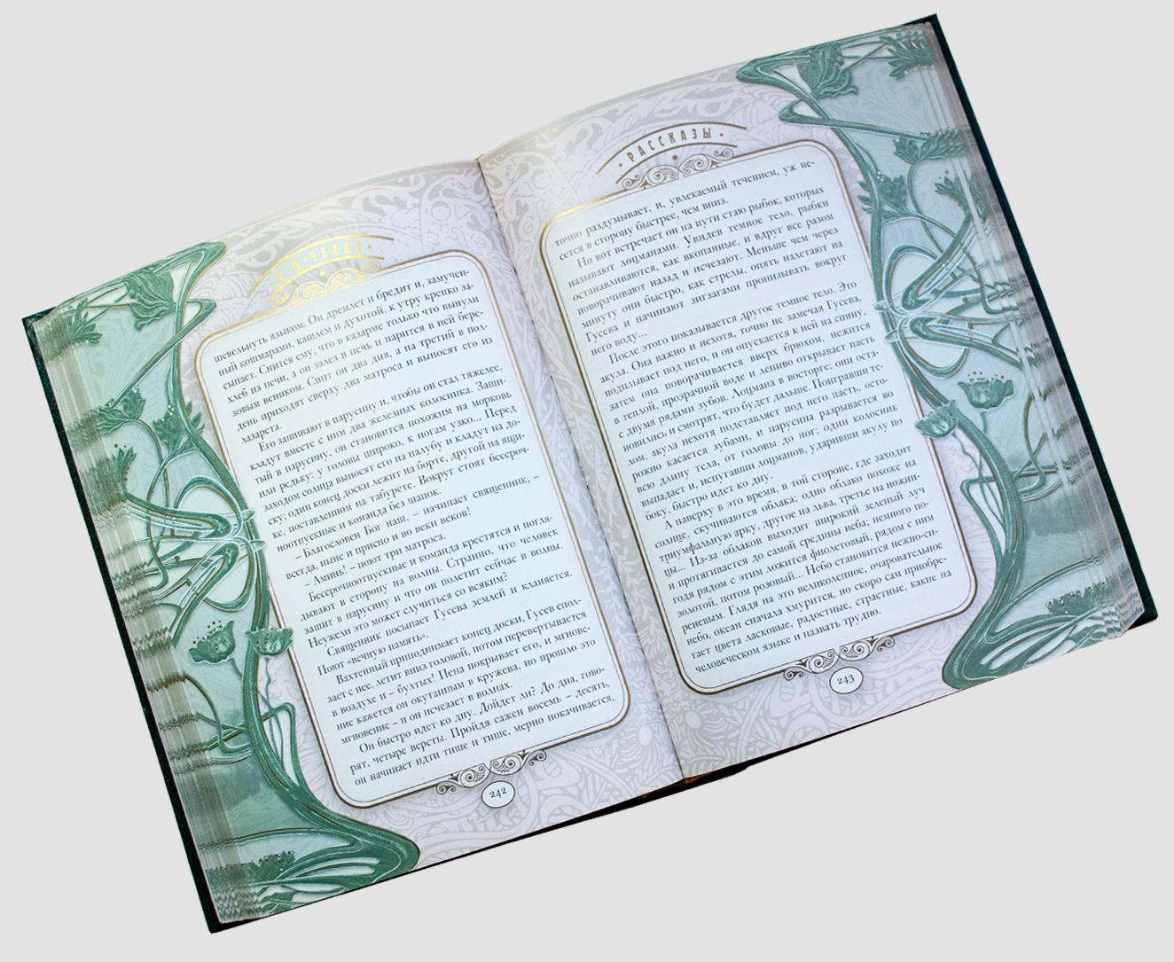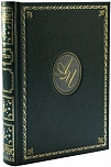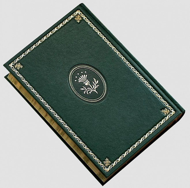 Особенности оформления: Все книги имеют трехсторонний золотой обрез и помещены в футляр из кожи ручной работы с тиснением фольгой на всех сторонках футляра. Количество тиснений фольгой составляет до 9 различных цветов на обложке и футляре. Внутреннее оформление большинства книг печатается в 5 цветов (4 + золото) на каждой полосе.