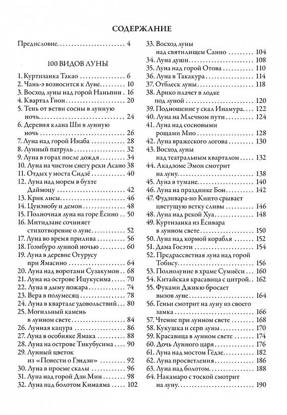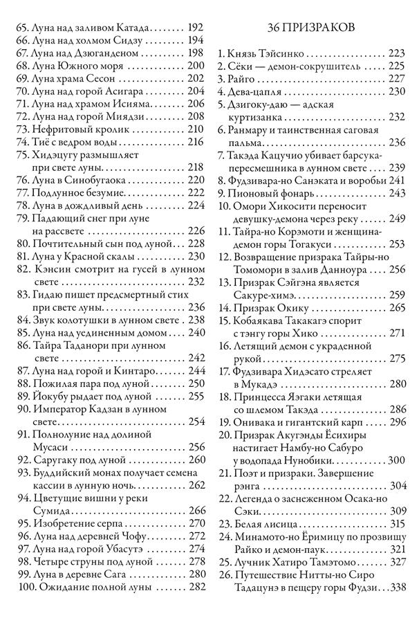 Книга включает две самые знаменитые серии гравюр знаменитого японского мастера укиё-э XIX века Цукиока Ёситоси: «100 видов луны» и «36 призраков». Эти работы стали вершиной его творчества. В книге каждое изображение из этих серий сопровождает текст, увлекательно рассказывающий о героях, изображенных на рисунках — знаменитых полководцах, императорах, самураях, поэтах, куртизанках или призраках и сказочных персонажах. В результате история старой Японии предстает перед читателем в виде ярких запоминающихся образов.