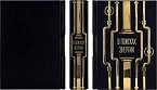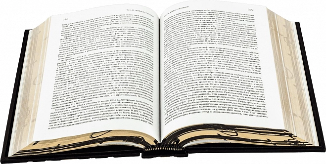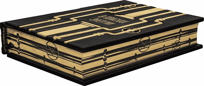 Составной переплет «Брадель», ручной работы, выполнен из натуральной кожи «Robbat Nero» производства итальянской кожевенной фабрики «Carisma». Обложка книги двухуровневая, оформлена рельефным золотым тиснением (с использованием фольги «Luxor 240») и накладными декоративными латунными элементами. Обрез выполнен в уникальной технологии художественной запечатки золотой основы.