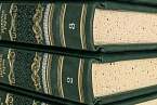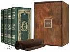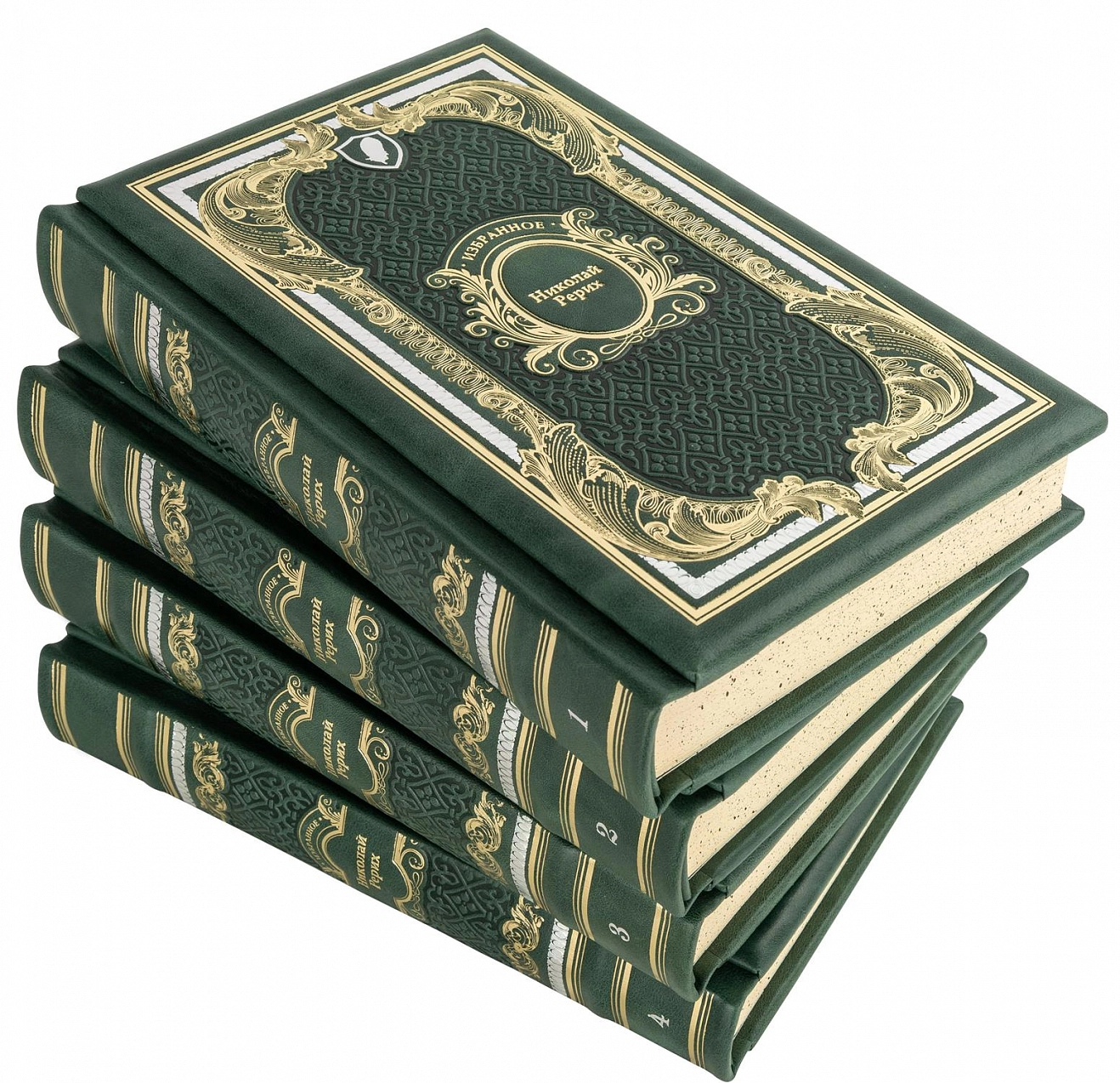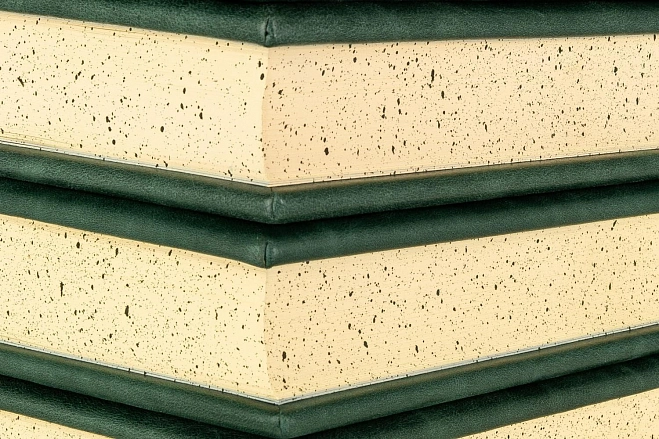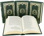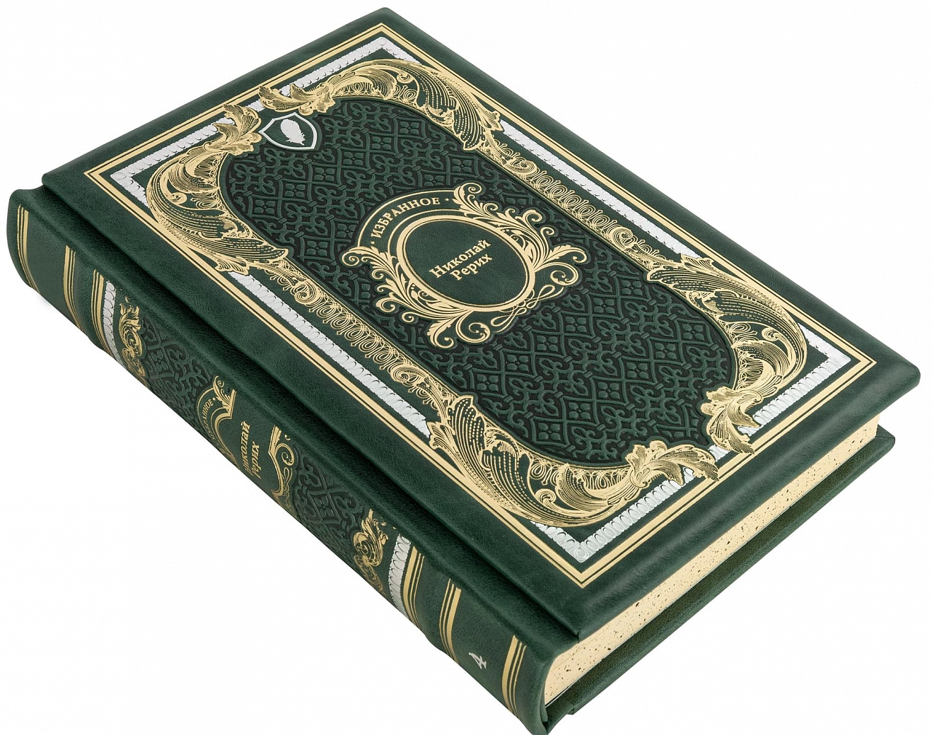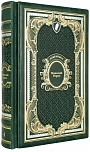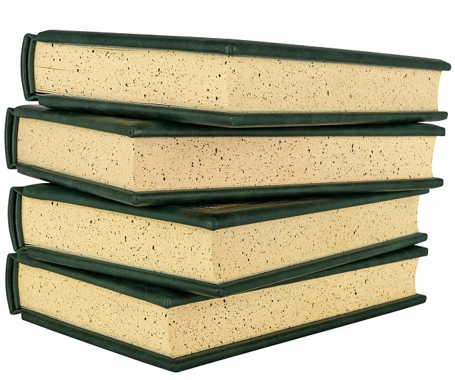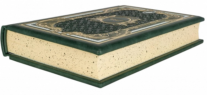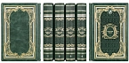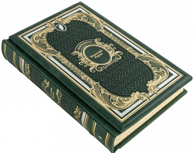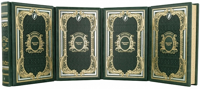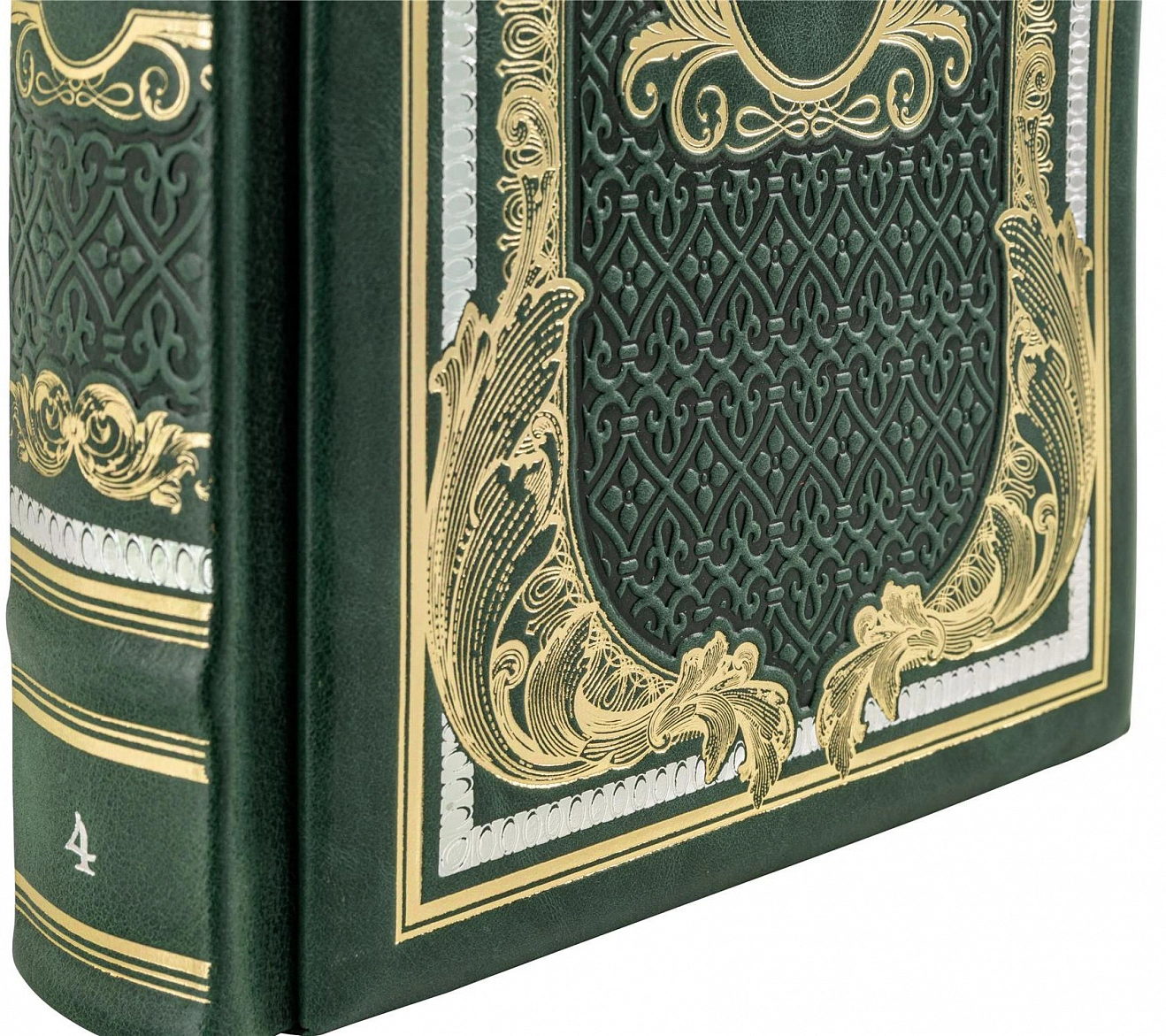 Составной переплет «Брадель» ручной работы, выполнен из натуральной кожи «Robbat Verde» производства итальянской кожевенной фабрики Carisma». Обложка книг оформлена комбинацией многоуровневого объемного тиснения: рельефного золотого и серебряного, c использованием фольги «Luxor 240» и глубокого блинтового. Обрезы книг выполнены в авторской технике позолоты с нанесением орнамента.