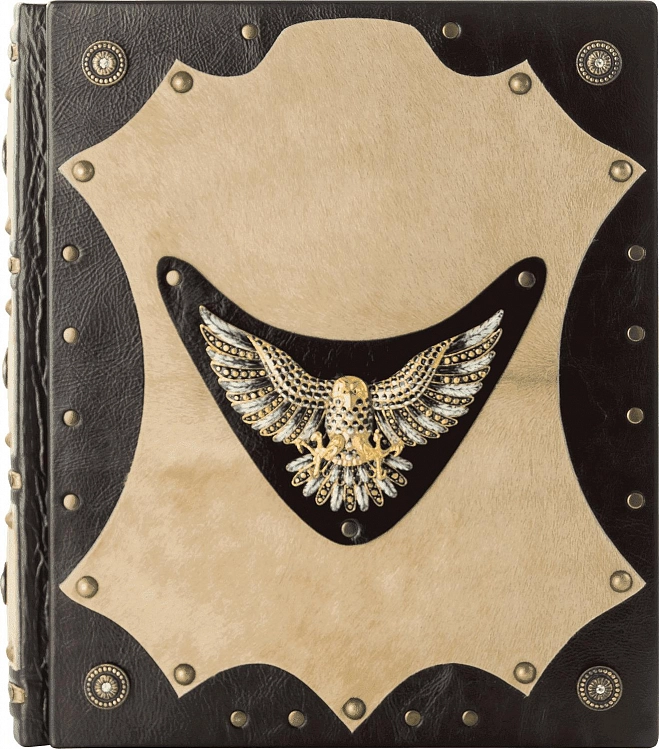 Кожаный переплет ручной работы выполнен из комбинации натуральной кожи «Plonge Braun» и шкуры пони итальянского производства. Обложка книги оформлена латунными и медными холитенами общим количеством 47 шт., фурнитурой «Ferre», количеством 7 шт., художественным литьем «Орел», инкрустированным камнями циркон. Подарочный футляр, выполнен из натурального дуба и кожи. Уникальная конструкция позволяет трансформировать его в подставку для более выгодного ракурса книги. Комплектация: Сертификат. Бархатный чехол.
