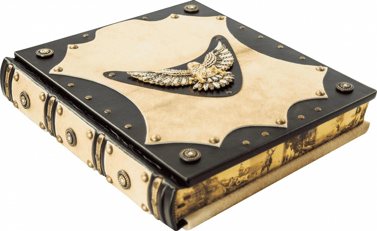 Кожаный переплет ручной работы выполнен из комбинации натуральной кожи «Plonge Braun» и шкуры пони итальянского производства. Обложка книги оформлена латунными и медными холитенами общим количеством 47 шт., фурнитурой «Ferre», количеством 7 шт., художественным литьем «Орел», инкрустированным камнями циркон. Подарочный футляр, выполнен из натурального дуба и кожи. Уникальная конструкция позволяет трансформировать его в подставку для более выгодного ракурса книги. Комплектация: Сертификат. Бархатный чехол.