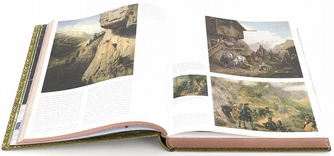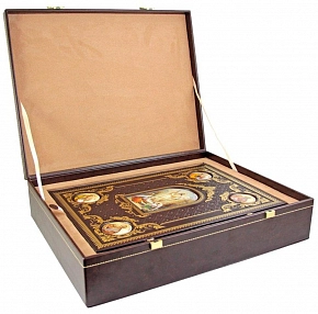 Переплет цельнокожаный, из натуральной шагрени (Франция). Книга исполнена по старинной французской технологии на 4-х шнурах. Бинты на корешке. Ручное тиснение на крышках и корешке. Обложка украшена барельефом. Форзац выполнен из мраморной бумаги ручного крашения. Дублюра окатана орнаментом вручную. Обрез окрашен, торшонирован и отгравирован. Индивидуальный полукожаный футляр.