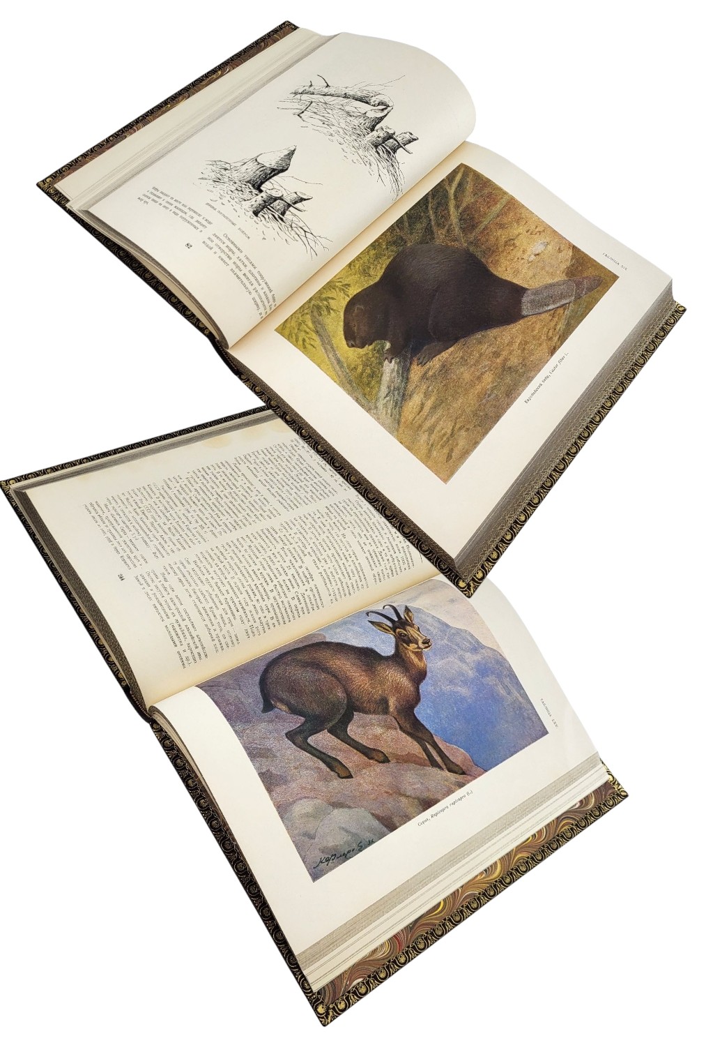 Подарочная книга "Атлас охотничьих и промысловых птиц и зверей СССР." (В 2 томах) СОДЕРЖАНИЕ Т. 1-2. М.; Л.: Изд. Академии наук СССР, 1950-1953. Т. 1: Птицы. 372 с., 66 л. ил.: ил. Т. 2: Звери. 293 с., 70 л. ил.: ил. ОПИСАНИЕ Владельческая подпись на титульных листах. Издание содержит множество иллюстраций, цветных и черно-белых. Цветные иллюстрации исполнены художниками В. Ватагиным, А. Комаровым и т.д. Библиофильский, цельнокожаный переплет из шагреневой кожи. Блок перешит вручную, на шнуры. Форзацы из мраморной бумаги, по периметру окатаны вручную золотистым бордюрным орнаментом. Обрезы окрашены, а затем отгравированы вручную. Художественное, двухцветное тиснение обложки и корешка, в том числе ручное. Ручная роспись по коже. Фигурный футляр с вырезом, с кожаной окантовкой и ручной накаткой орнамента.