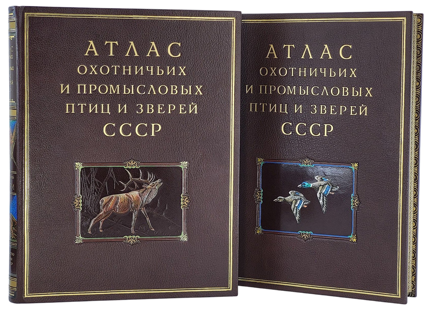 Подарочная книга "Атлас охотничьих и промысловых птиц и зверей СССР." (В 2 т. Эксклюзивный экземпляр с ручной росписью по коже)