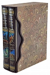 Библиофильский, цельнокожаный переплет из шагреневой кожи. Блок перешит вручную, на шнуры. Форзацы из мраморной бумаги, по периметру окатаны вручную золотистым бордюрным орнаментом. Обрезы окрашены, а затем отгравированы вручную. Художественное, двухцветное тиснение обложки и корешка, в том числе ручное. Ручная роспись по коже. Фигурный футляр с вырезом, с кожаной окантовкой и ручной накаткой орнамента.