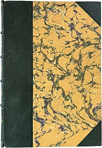 Стильный переплёт ручной работы из натуральной кожи, золотое тиснение, фигурная вырубка, элементы кожаной мозаики, трёхсторонний золотой обрез окрашен вручную с краплением. Накладки - литьё из латуни в виде охотничьего ружья. Подарочный короб.