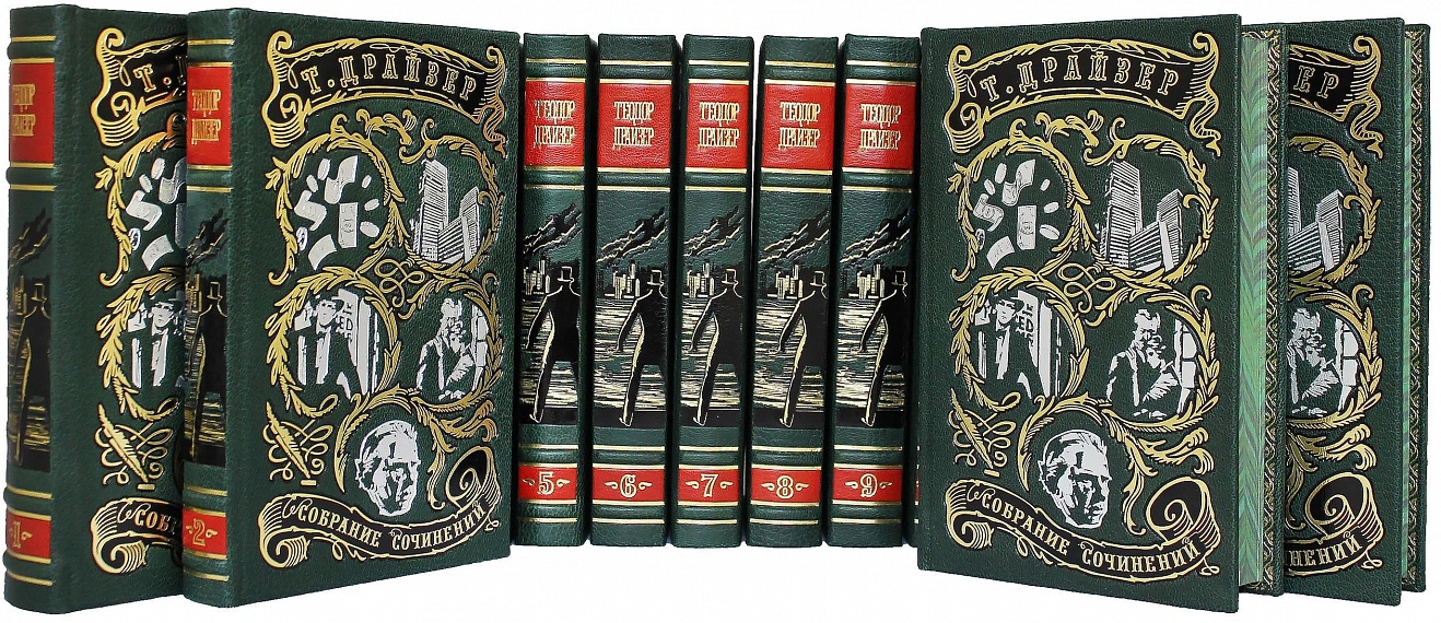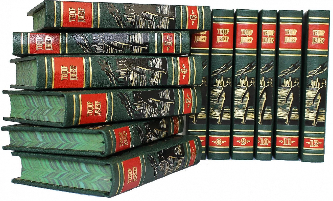 Сегодня творчество Драйзера является мощным оружием защиты мира, культуры, свободы. Собрание сочинений Теодора Драйзера. Том 1 "Сестра Керри" Том 2 "Дженни Герхардт" Том 3 "Финансист" Том 4 "Титан" Том 5 "Стоик" Том 6 "Гений" (книга 1) Том 7 "Гений" (книги 2, 3) Том 8 "Американская трагедия" (часть 1) Том 9 "Американская трагедия" (часть 2) Том 10 "Оплот" Том 11 Рассказы из сборников "Освобождение", "Двенадцать", "Краски большого города", "Цепи", "Галерея женщин" Том 12 Статьи и выступления