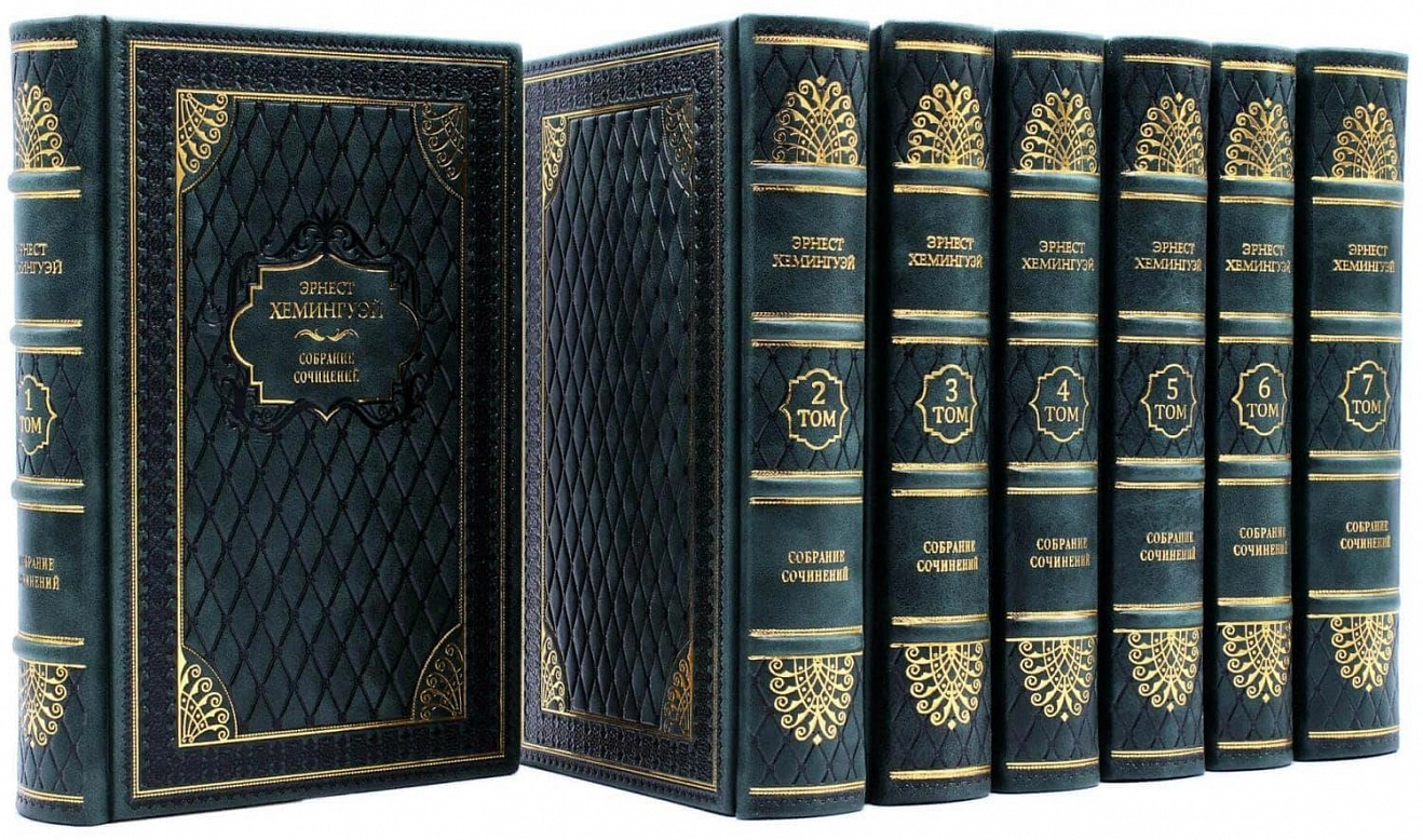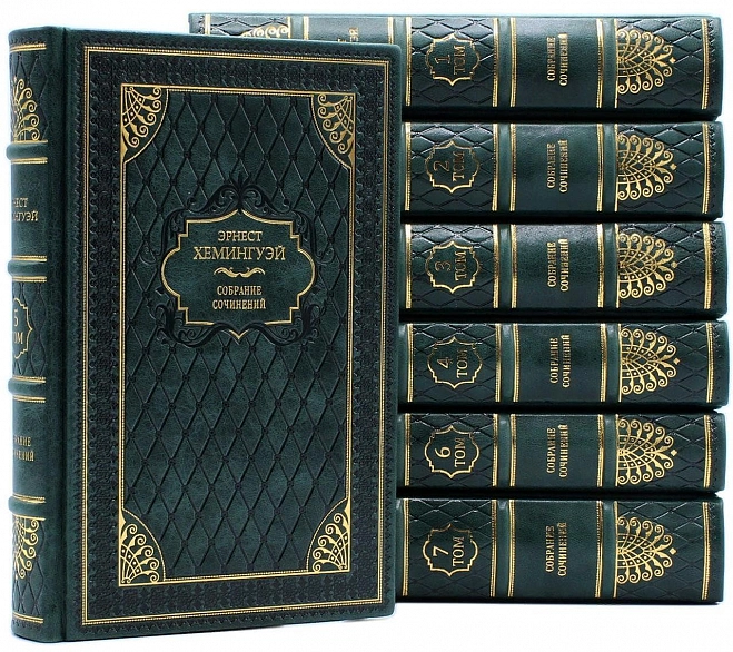 Подарочное собрание сочинений "Эрнест Хемингуэй" АННОТАЦИЯ Представляем вам наиболее полное русскоязычное собрание сочинений крупнейшего американского писателя XX века Эрнеста Хемингуэя (1899-1961). ОФОРМЛЕНИЕ Ручной кожаный переплет, блоки страниц отшлифованы и тонированы с нанесением узора. Тиснение золочением, стиль оформления разработан художниками, все материалы натуральные, высшего качества. СОДЕРЖАНИЕ Том 1: «В наше время», «Фиеста», «Вешние воды», «Мужчины без женщин» классика американской литературы XX века Эрнеста Хемингуэя. Том 2: «Прощай, оружие!», «Победитель не получает ничего», «Пятая колонна» классика американской литературы XX века Эрнеста Хемингуэя. Том 3: Роман «По ком звонит колокол» классика американской литературы XX века Эрнеста Хемингуэя. Том 4: Произведения «Зеленые холмы Африки», «Иметь и не иметь», «Праздник, который всегда с тобой» классика американской литературы XX века Эрнеста Хемингуэя. Том 5: «Старик и море», «Острова в океане» классика американской литературы XX века Эрнеста Хемингуэя. Том 6: Произведения «За рекой, в тени деревьев», «Лев мисс Мэри», «Опасное лето» классика американской литературы XX век Эрнеста Хемингуэя. Том 7: Роман «Райский сад», рассказы разных лет, очерки, статьи классика американской литературы XX века Эрнеста Хемингуэя.