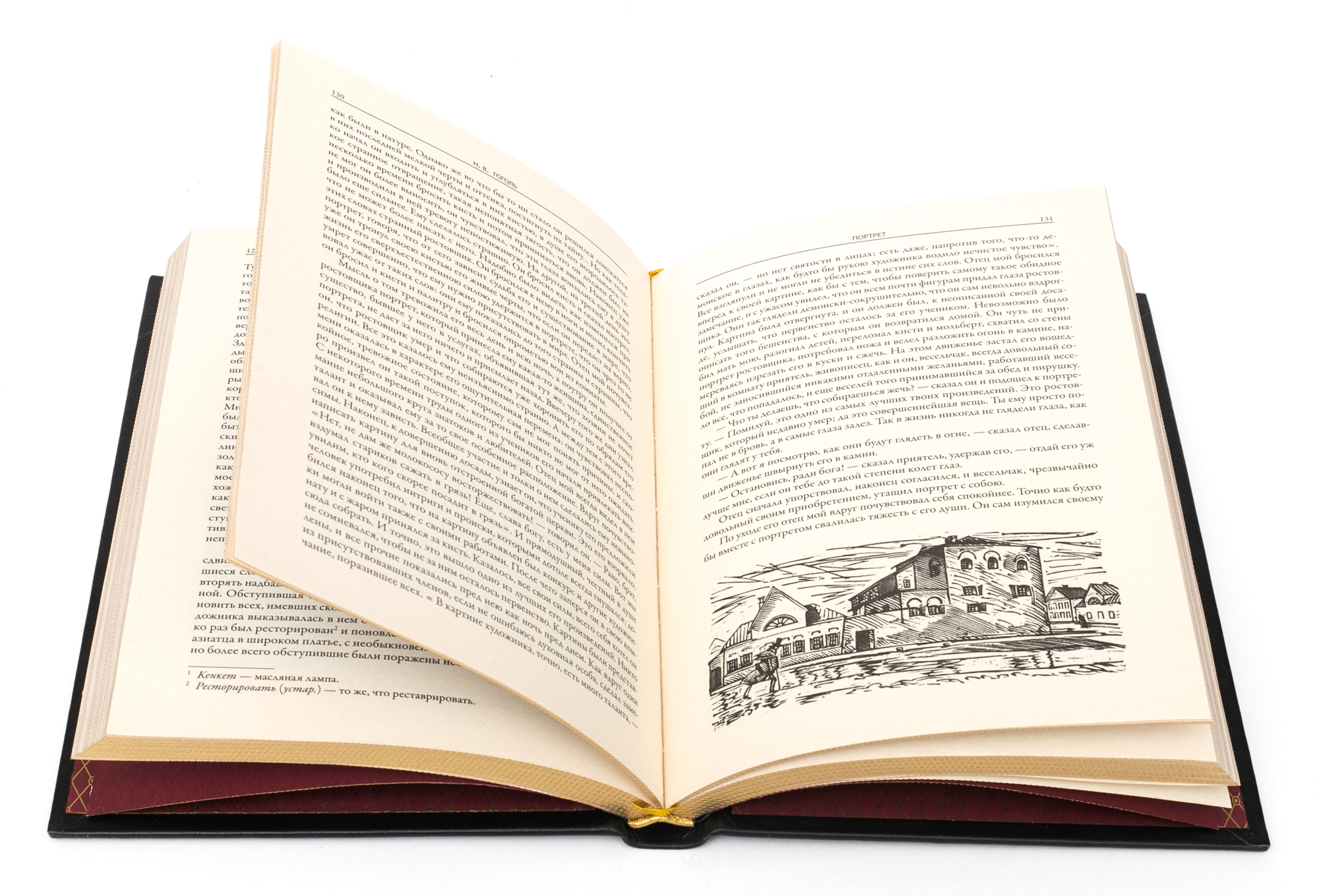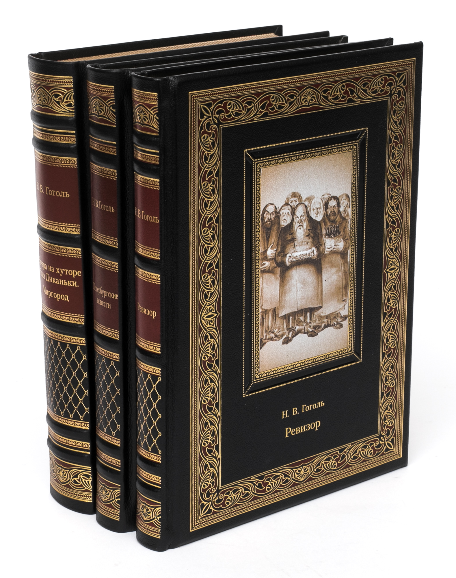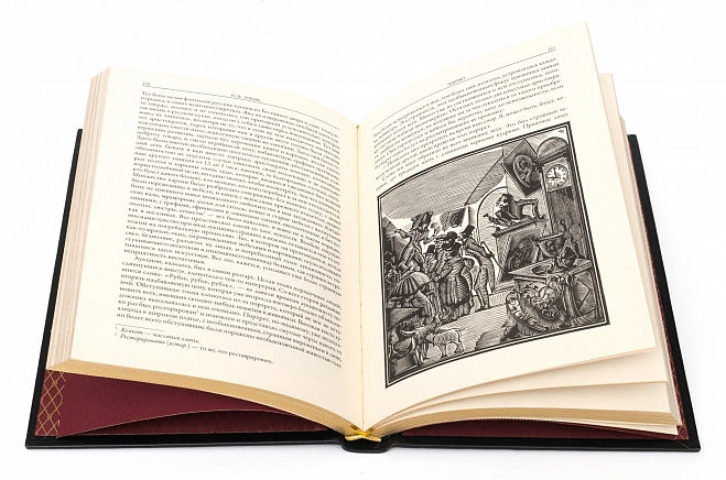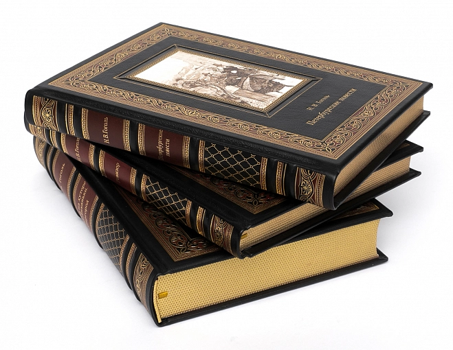 Подарочное собрание сочинений Н.В.Гоголь АННОТАЦИЯ В собрание сочинений вошли издания. Книга "Вечера на хуторе близ Диканьки. Миргород" Гоголь Н.В. В сборник вошли двенадцать первых повестей классика русской литературы Николая Васильевича Гоголя (1809–1852). Книга оформлена работами мастеров книжной иллюстрации Николая Ивановича Ткаченко (1866–1913) и Самуила Мартыновича Дудина-Марцинкевича (1863–1929). БМЛ "Петербургские повести" В сборник вошли «петербургские повести» классика русской и мировой литературы Николая Васильевича Гоголя (1809–1852): «Невский проспект», «Нос», «Портрет», «Шинель» и «Записки сумасшедшего», а также две «непетербургские» повести: «Коляска» и «Рим», традиционно печатаемые вместе с ними согласно авторскому замыслу. Книга проиллюстрирована 132 рисунками художников Игоря Эммануиловича Грабаря (Храброва) (1871–1960), Николая Андреевича Зубчанинова (1866–1908), Дмитрия Николаевича Кардовского (1866–1943), Алексея Ильича Кравченко (1889–1940), Ральфа Федоровича Штейна (1854–1896) и 28 гравюрами с актера Василия Николаевича Андреева-Бурлака (1843–1888). Книга "Ревизор" Гоголь Н.В. Бессмертная комедия классика русской и мировой литературы Николая Васильевича Гоголя (1809–1852) проиллюстрирована 95 рисунками художников Владимира Амосовича Табурина (1864–1919) и Петра Михайловича Боклевского (1816–1897); портрет автора — работы Дмитрия Николаевича Кардовского (1866–1943). В книгу вошли также варианты различных сцен, пьеса «Театральный разъезд после представления новой комедии», статья и примечания к «Ревизору» Василия Васильевича Гиппиуса (1890–1942) и другие дополнительные материалы. ОПИСАНИЕ Классический европейский переплёт ручной работы из натуральной кожи. Форзац из дизайнерской бумаги Malmero с тиснением орнамента золотой фольгой. 6 бинтов на корешке, ручной обработки. Каптал золотой из натуральной кожи. Обрез блока - золото с торшонированием. Тиснение блинтовое, золотой и цветной фольгой. Ляссе. Инкрустация кожаной вставкой с полноцветной печатью.