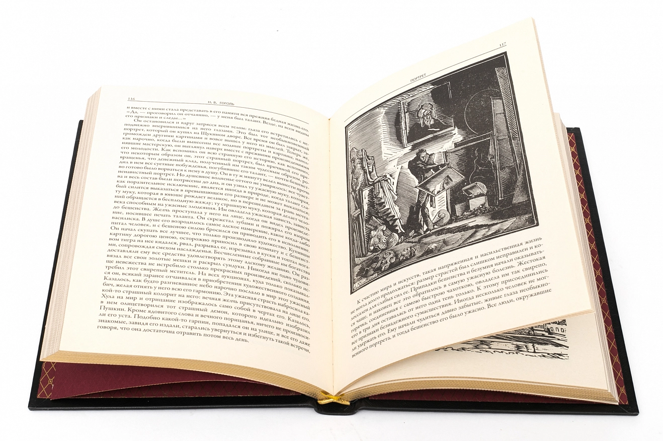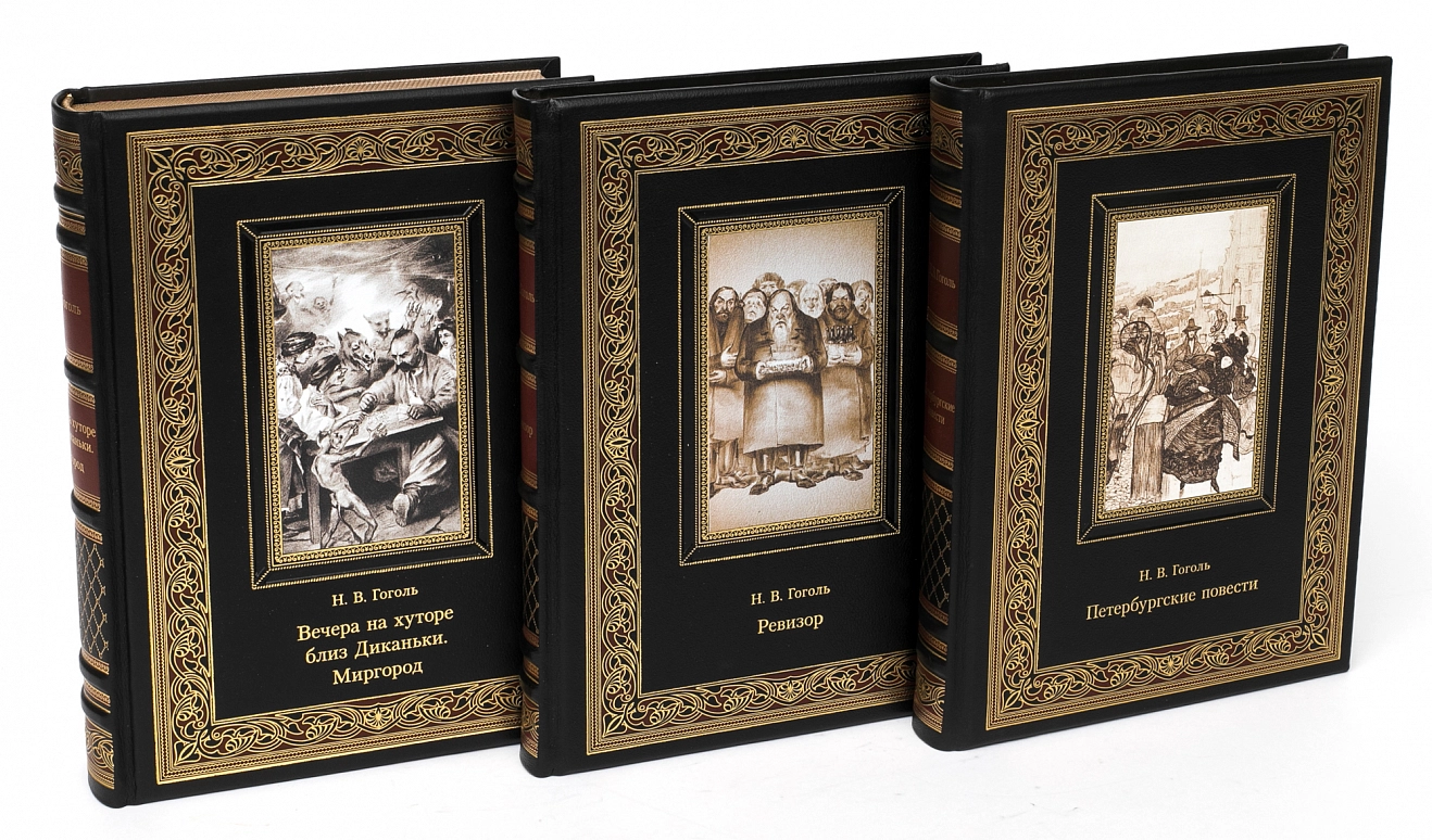 Подарочное собрание сочинений Н.В.Гоголь АННОТАЦИЯ В собрание сочинений вошли издания. Книга "Вечера на хуторе близ Диканьки. Миргород" Гоголь Н.В. В сборник вошли двенадцать первых повестей классика русской литературы Николая Васильевича Гоголя (1809–1852). Книга оформлена работами мастеров книжной иллюстрации Николая Ивановича Ткаченко (1866–1913) и Самуила Мартыновича Дудина-Марцинкевича (1863–1929). БМЛ "Петербургские повести" В сборник вошли «петербургские повести» классика русской и мировой литературы Николая Васильевича Гоголя (1809–1852): «Невский проспект», «Нос», «Портрет», «Шинель» и «Записки сумасшедшего», а также две «непетербургские» повести: «Коляска» и «Рим», традиционно печатаемые вместе с ними согласно авторскому замыслу. Книга проиллюстрирована 132 рисунками художников Игоря Эммануиловича Грабаря (Храброва) (1871–1960), Николая Андреевича Зубчанинова (1866–1908), Дмитрия Николаевича Кардовского (1866–1943), Алексея Ильича Кравченко (1889–1940), Ральфа Федоровича Штейна (1854–1896) и 28 гравюрами с актера Василия Николаевича Андреева-Бурлака (1843–1888). Книга "Ревизор" Гоголь Н.В. Бессмертная комедия классика русской и мировой литературы Николая Васильевича Гоголя (1809–1852) проиллюстрирована 95 рисунками художников Владимира Амосовича Табурина (1864–1919) и Петра Михайловича Боклевского (1816–1897); портрет автора — работы Дмитрия Николаевича Кардовского (1866–1943). В книгу вошли также варианты различных сцен, пьеса «Театральный разъезд после представления новой комедии», статья и примечания к «Ревизору» Василия Васильевича Гиппиуса (1890–1942) и другие дополнительные материалы. ОПИСАНИЕ Классический европейский переплёт ручной работы из натуральной кожи. Форзац из дизайнерской бумаги Malmero с тиснением орнамента золотой фольгой. 6 бинтов на корешке, ручной обработки. Каптал золотой из натуральной кожи. Обрез блока - золото с торшонированием. Тиснение блинтовое, золотой и цветной фольгой. Ляссе. Инкрустация кожаной вставкой с полноцветной печатью.