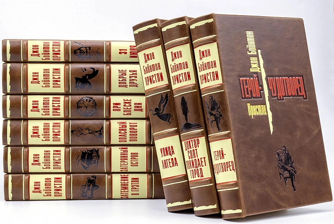Подарочное издание в кожаном переплёте, собрание произведений Джон Бойнтон Пристли в 9 томах. Французский стиль ручного, кожаного переплета. Специально для данного собрания книг разработан дизайн тиснения. Книги можно заказать на здесь на сайте или приехать к нам на производство и посмотреть как создаются такие удивительные книги.