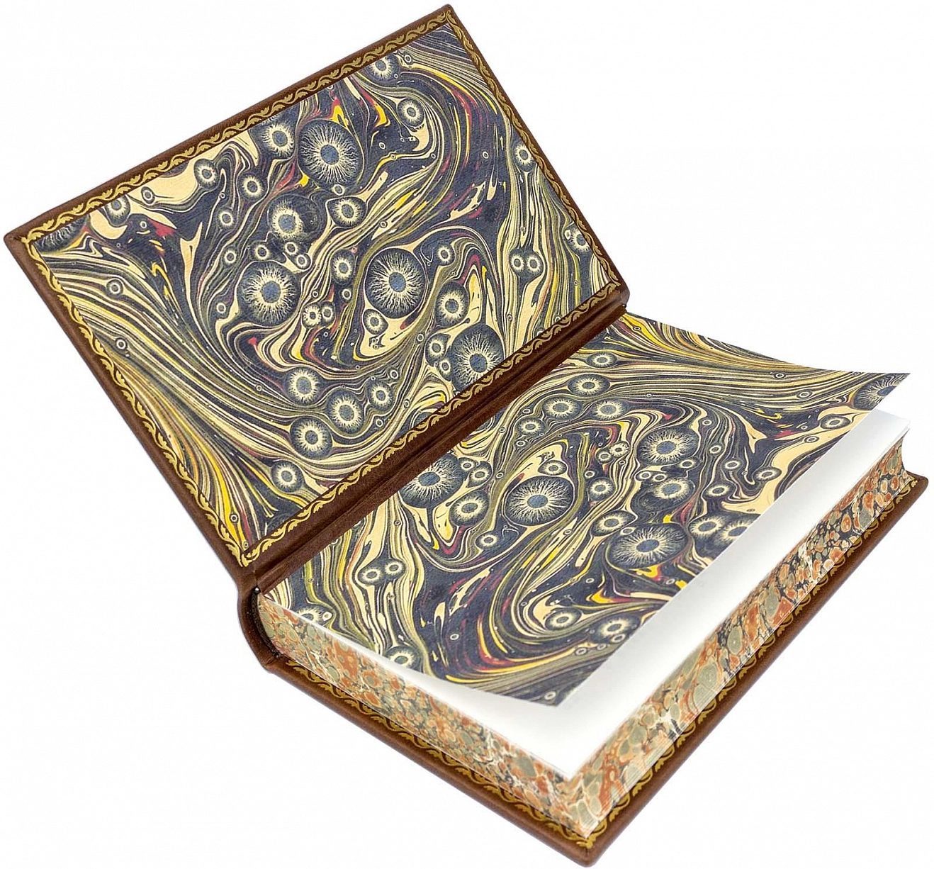 Французский стиль кожаного переплета, тиснение цветное по коже. Обрезы блока страниц и дублюра окрашены в стиль мраморной бумаги. Как всегда использованы только лучшие материалы.
