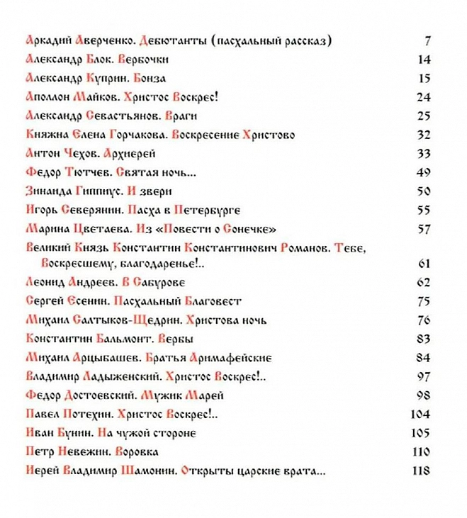 Авторы прозы и поэзии: Аркадий Аверченко, Александр Блок, Александр Куприн, Апполон Майков, Александр Севастьянов, Княжна Елена Горчакова, Антон Чехов, Федор Тютчев, Зинаида Гиппиус, Игорь Северянин, Марина Цветаева, Великий Князь Константин Константинович Романов, Леонид Андреев, Сергей Есенин, Михаил Салтыков-Щедрин, Константин Бальмонт, Михаил Арцыбашев, Владимир Ладыженский, Федор Достоевский, Павел Потехин, Иван Бунин, Петр Невежин, Иерей Владимир Шамонин, Николай Лесков, Михаил Кузьмин, Алексей Хомяков, Василий Бажанов, Федор Сологуб, Иван Бунин, Тэффи, Константин Бальмонт, Саша Черный, Яков Полонский, Владимир Набоков, Лидия Чарская, Евгений Погожин.