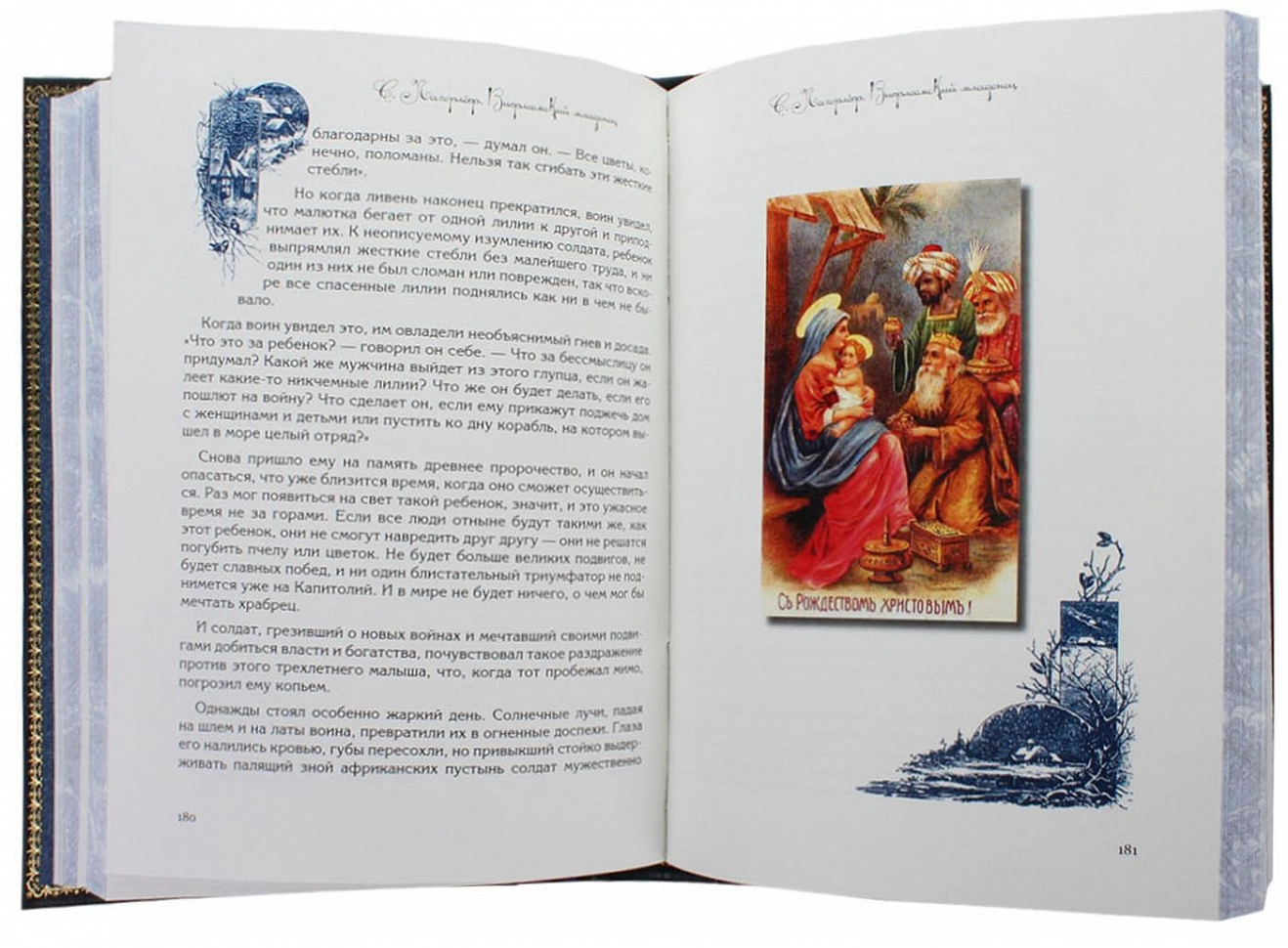 Подарочная книга "Пока часы двенадцать бьют" АННОТАЦИЯ В альманах вошли рассказы на новогоднюю и рождественскую тематику великих русских и зарубежных авторов, таких как Пастернак, Гофман, Андерсен, Лагерлеф и других. Книга подарит вам настоящее новогоднее настроение и согреет вас своим теплом холодным зимним вечером. ОПИСАНИЕ Цельнокожаный переплёт ручной работы, украшен золотым и серебряным тиснением. Корешок декорирован бинтами. Текст книги напечатан на бумаге Palatina Avorio 100 Австрийского производства и дополнен цветными иллюстрациями. Обрез оформлен в технике "Перо павлина". Ляссе из шёлковой ленты. Форзац цельный из дизайнерской бумаги. Дублюра окатана золотом. Книга представлена в оригинальной подарочной упаковке. Цветовое сочетание переплёта и упаковки может отличаться от представленных на фото.