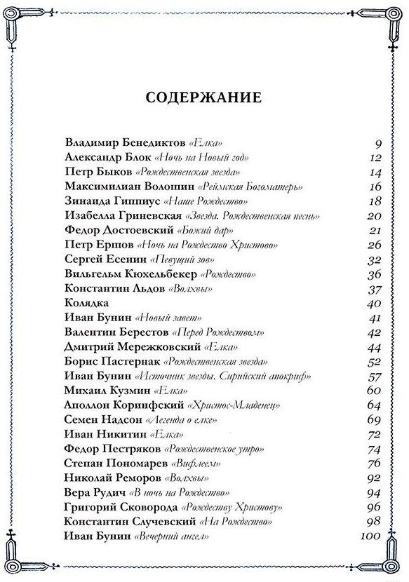 Добрые и светлые рождественские стихи великих русских и иностранных поэтов и писателей. В альманахе собраны стихи Ахматовой, Гумилева, Блока, Бунина, Волошина, Гиппиус, Достоевского, Есенина, Лермонтова, Мандельштама, Набокова, Пастернака, Пушкина, Фета, Ходасевича, Цветаевой и многих других. Книга проиллюстрирована старинными рождественскими и новогодними открытками.