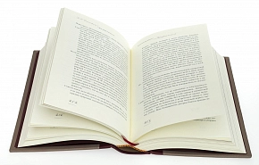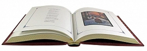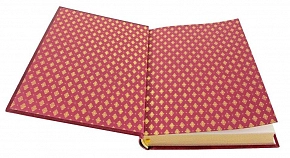 Переплёт ручной работы из эко-кожи, форзац из дизайнерской бумаги, 4 бинта на корешке, ручной обработки, каптал золотой из натуральной кожи, обрез блока торшонированный золотой, инкрустация кожаной вставкой с печатью, тиснение блинтовое, золотой и серебряной фольгой, ляссе.