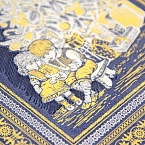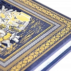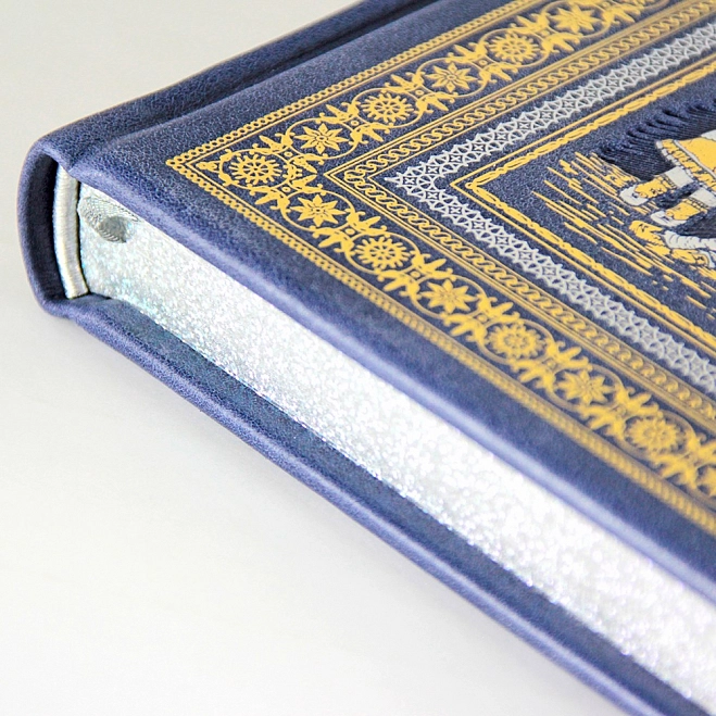 Переплёт ручной работы из натуральной кожи, форзац из дизайнерской бумаги, 4 бинта на корешке, ручной обработки, каптал золотой из натуральной кожи, инкрустация кожаной вставкой с печатью, тиснение блинтовое, золотой и серебряной фольгой, ляссе.
