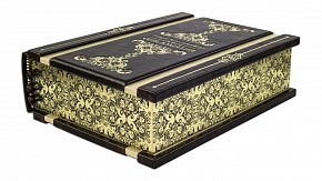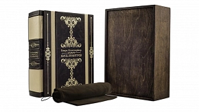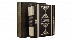 Составной переплет «Брадель» ручной работы, выполнен из натуральных кож (кожа «Сrepa luce», кожа «Bordeaux scuro» производства итальянской кожевенной фабрики «Carisma»). Обложка книги уникальной архитектуры, двухуровневая, оформлена золотым тиснением, с использованием фольги «Luxor 240». Обрез книги выполнен в уникальной технологии художественной запечатки золотой основы.
