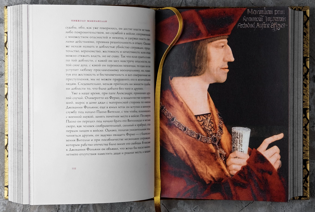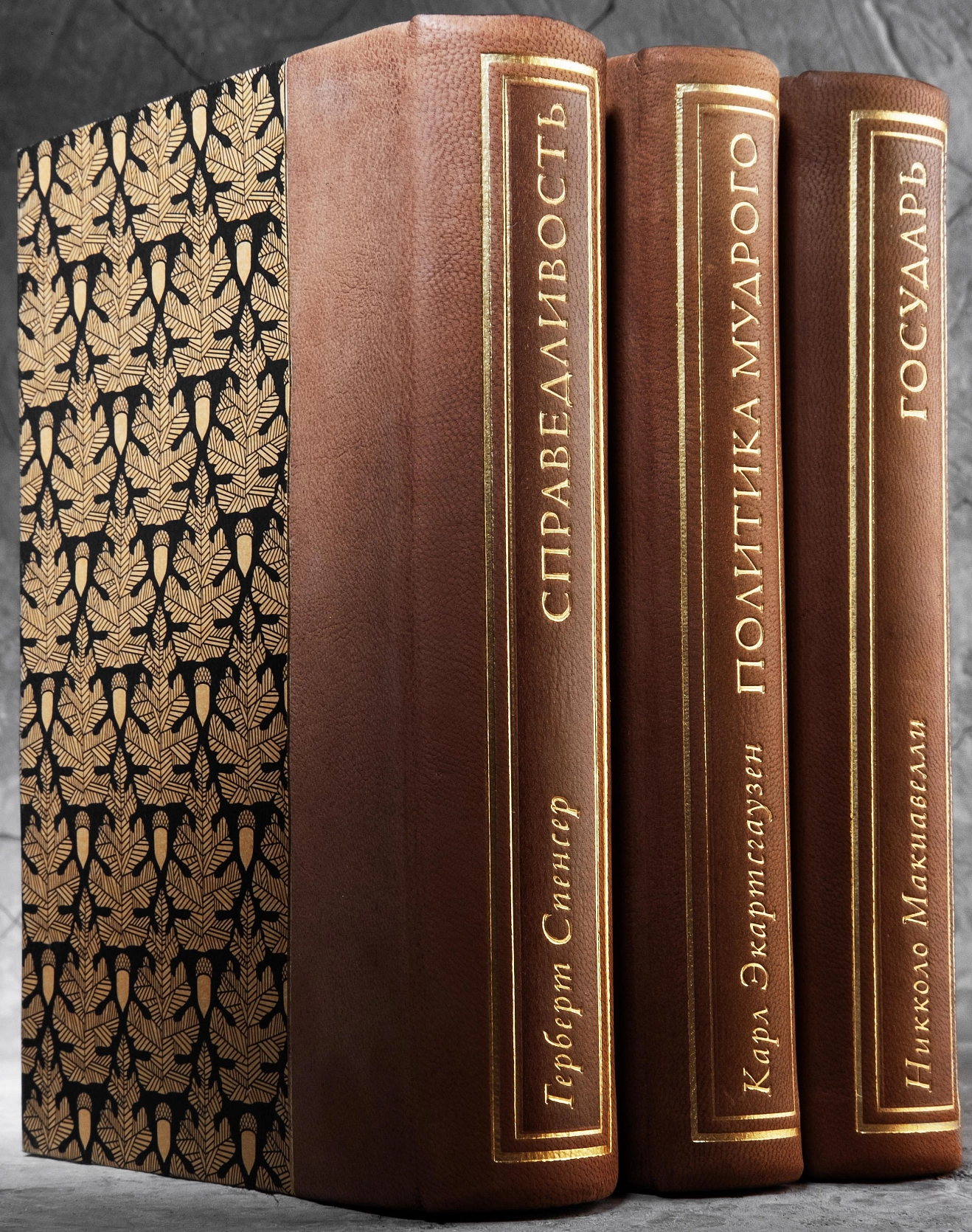 Теперь самые интересные и полезные книги в одном комплекте: «Государь» Макиавелли — о достижении цели любыми путями и средствами; «Справедливость» Спенсера — о том, как подходить к основным вопросам права, основываясь на этическом учении автора; «Политика мудрого» Экартсгаузена предлагает испытанную столетиями стратегию достижения успеха и карьерных высот. Все эти сокровища напечатаны на бумаге высокого качества и облачены в ручные составные переплеты из кожи и дизайнерской бумаги, а также помещены в общий стильный футляр ручной работы.