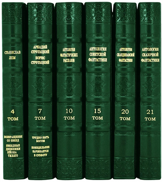 БИБЛИОТЕКА СОВРЕМЕННОЙ ФАНТАСТИКИ (25 КНИГ) АННОТАЦИЯ Легендарная серия научной фантастики московского издательства «Молодая гвардия». Издавалась с 1967 года тиражом от 65 000 до 100 000 экземпляров. Небольшие по объему и высоте книги выходили как в мягкой, так и в твердой обложках. Мы представляем собрание в 25 книгах, в которое вошли как произведения отдельных авторов (Стругацкие, Лем и т.д), так и несколько антологий (сказочная фантастика, скандинавская фантастика, рассказы и др). ОФОРМЛЕНИЕ Все книги серии переплетены в натуральную, темно-зелёную кожу, с лаконичным тиснением на обложке и корешках. Форзац выполнен из темно-зеленого бархата и декорирован золотистым бордюрным орнаментом.
