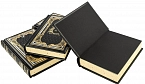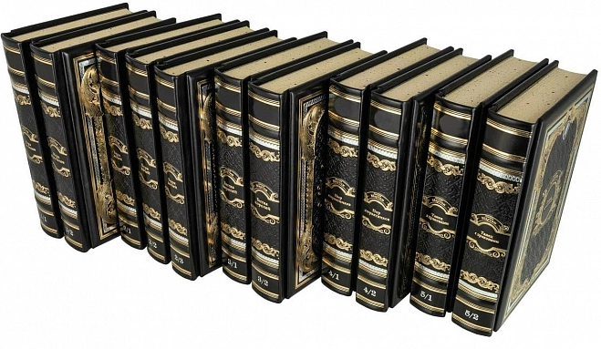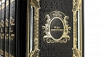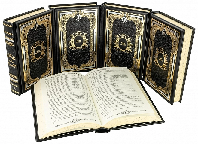 Составной переплет «Брадель» ручной работы, выполнен из натуральной кожи «Robbat Nero» производства итальянской кожевенной фабрики Carisma». Обложка книг оформлена комбинацией многоуровневого объемного тиснения: рельефного золотого и серебряного, c использованием фольги «Luxor 240» и глубокого блинтового. Обрезы книг выполнены в авторской технике позолоты с нанесением орнамента.
