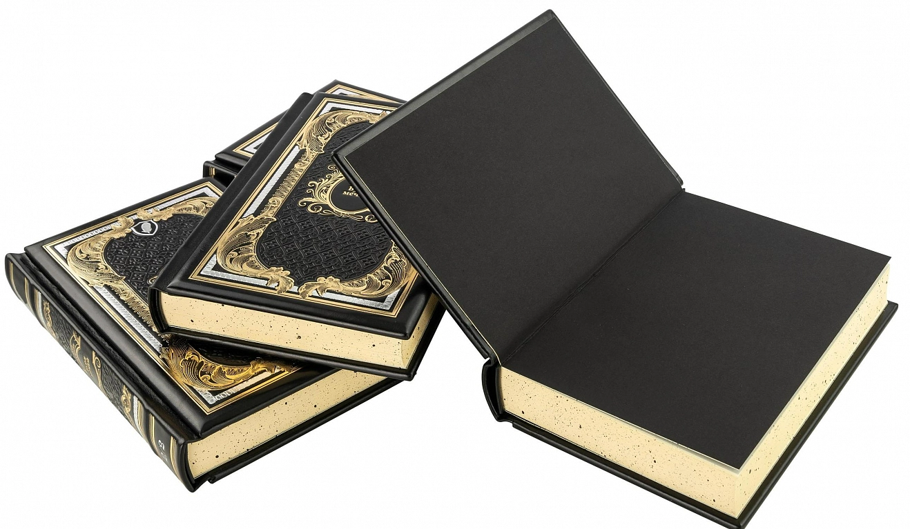 Составной переплет «Брадель» ручной работы, выполнен из натуральной кожи «Robbat Nero» производства итальянской кожевенной фабрики Carisma». Обложка книг оформлена комбинацией многоуровневого объемного тиснения: рельефного золотого и серебряного, c использованием фольги «Luxor 240» и глубокого блинтового. Обрезы книг выполнены в авторской технике позолоты с нанесением орнамента.