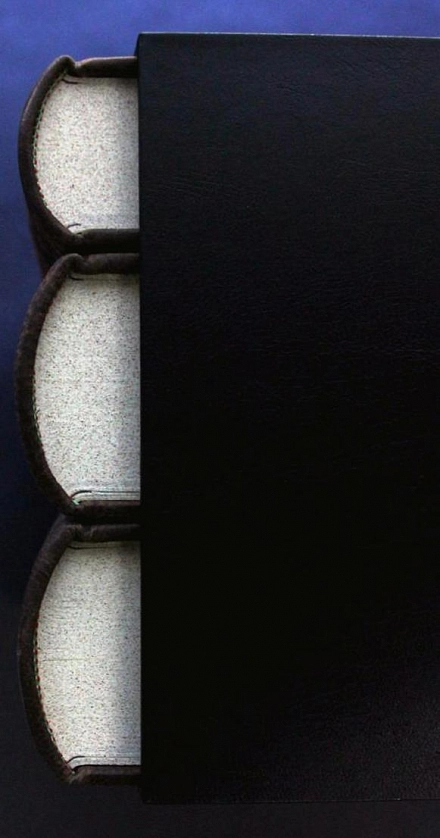 Бинты и наклейки из контрастной кожи на корешке, переплет украшен блинтовым тиснением и тиснением золотой фольгой, форзацы украшены мраморной бумагой