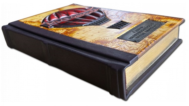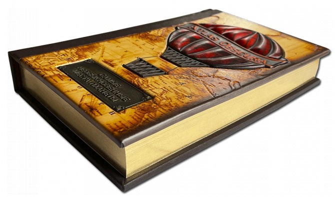 Подарочное издание в кожаном переплете ручной работы из натуральной кожи с трехсторонним золотым обрезом. В качестве оформления использована объёмная 3D накладка из кожи с фотопечатью в виде воздушного шара и деревянные художественные вставки.