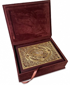 Подарочная книга "Коран" С филигранью (золото), литьем и гранатами в замшевой шкатулке.