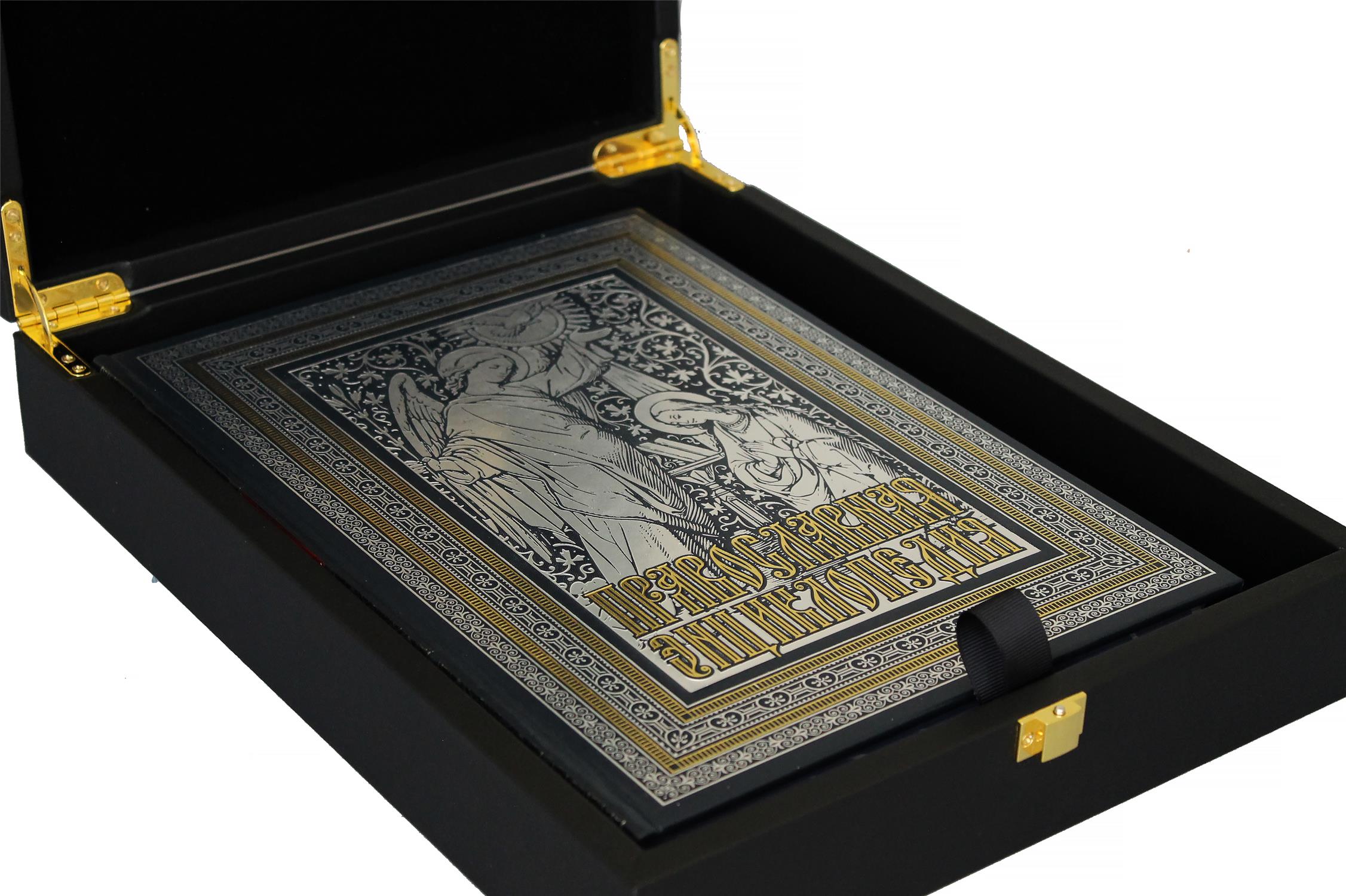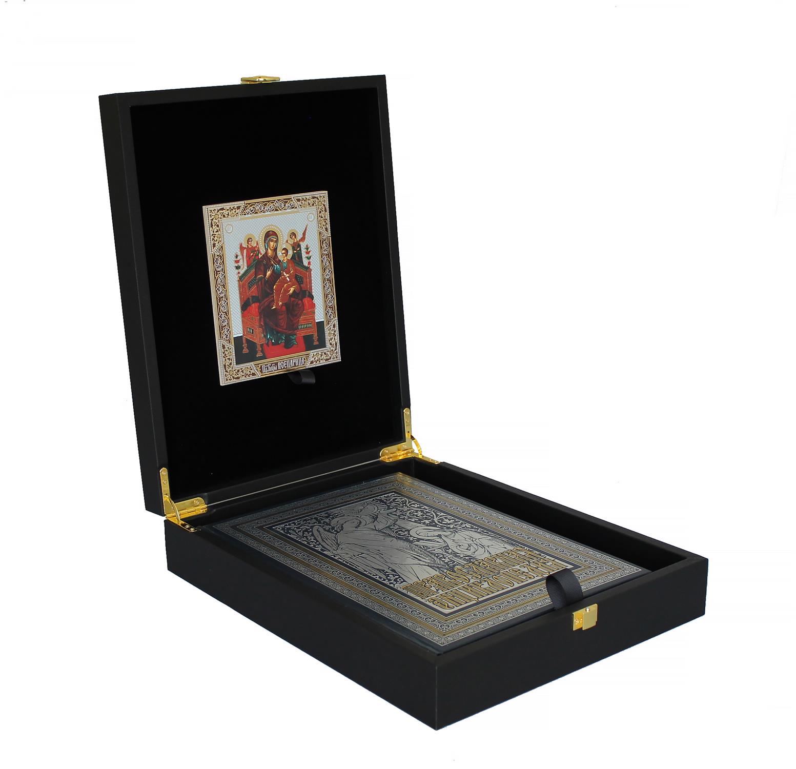 Оригинальный подарочный набор включает в себя книгу в кожаном переплете "Православная энциклопедия" и икону, оформленных в деревянной коробке, обтянутой кожей. Дизайн издания представлен сочетанием золотого и цветного тиснения, и дополнен кожаной вставкой, выполненной из другого вида кожи. Богато оформленные дюблюрами составные форзацы, шелковое ляссе. Икона выполнена методом принта на деревянной основе.