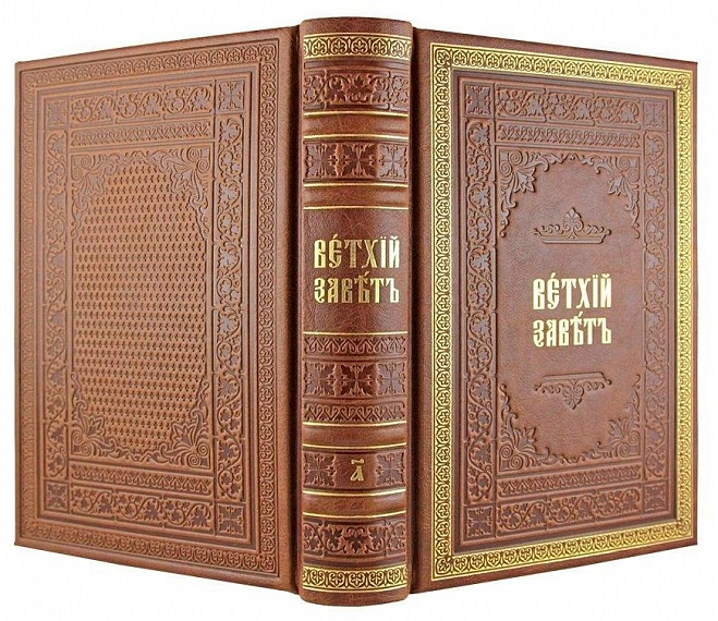 БИБЛИЯ. КНИГИ СВЯЩЕННОГО ПИСАНИЯ ВЕТХОГО ЗАВЕТА. В ДВУХ ТОМАХ. АННОТАЦИЯ Репринтное воспроизведение издания: «Библия, сиречь Книги Священного Писания Ветхого Завета. Москва, 1879 г.». Гриф ИС Р21-039-3439 ИСПОЛНЕНИЕ Переплёт ручной работы из натуральной кожи. Форзац из дизайнерской бумаги. 4 бинта на корешке, ручной обработки. Каптал золотой из натуральной кожи. Обрез блока торшонированный золотой. Тиснение блинтовое и золотой фольгой. Ляссе. ПОДАРОЧНАЯ УПАКОВКА Книги упакованы в подарочный короб из флокированной дизайнерской бумаги Lynel Tann.