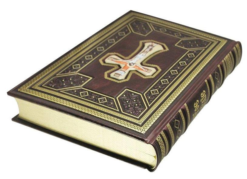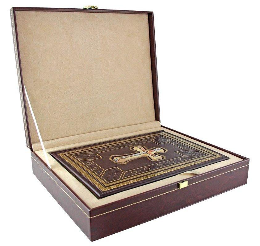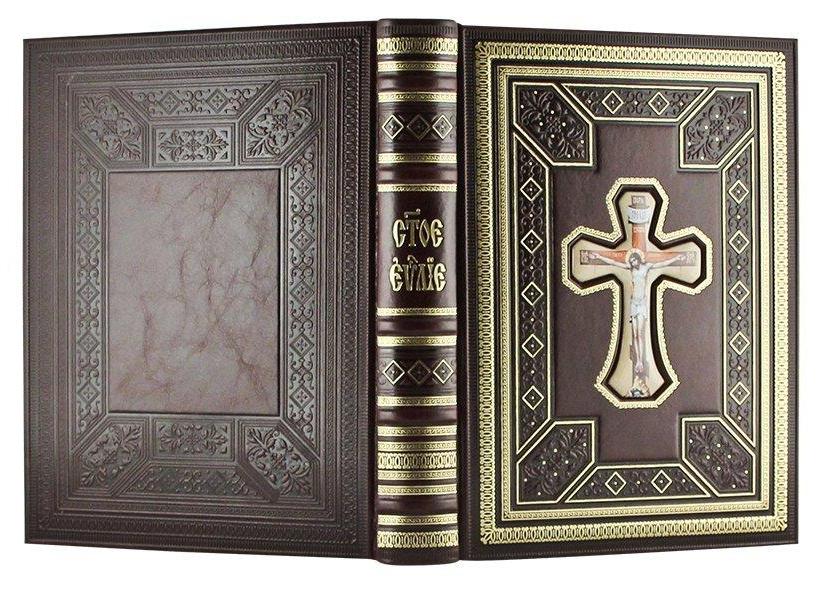 СВЯТОЕ ЕВАНГЕЛИЕ АННОТАЦИЯ Святое Евангелие - это жизнеописание Иисуса Христа. Книга, в которой рассказывается о божественной природе Иисуса Христа, его рождении, жизни, чудесах, смерти, воскресении и вознесении. ИСПОЛНЕНИЕ Переплёт ручной работы из натуральной кожи. Форзац из дизайнерской бумаги. 5 бинтов на корешке, ручной обработки. Каптал золотой из натуральной кожи. Обрез блока торшонированный золотой. Тиснение блинтовое и золотой фольгой. Ляссе. Крупный шрифт. ПОДАРОЧНАЯ УПАКОВКА коробка с прошивкой, на замке, с ложементом. картон/эко-кожа 270х325х80 мм